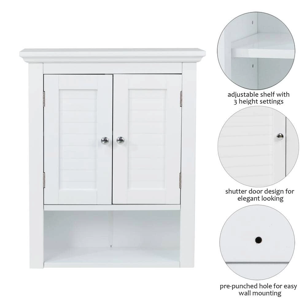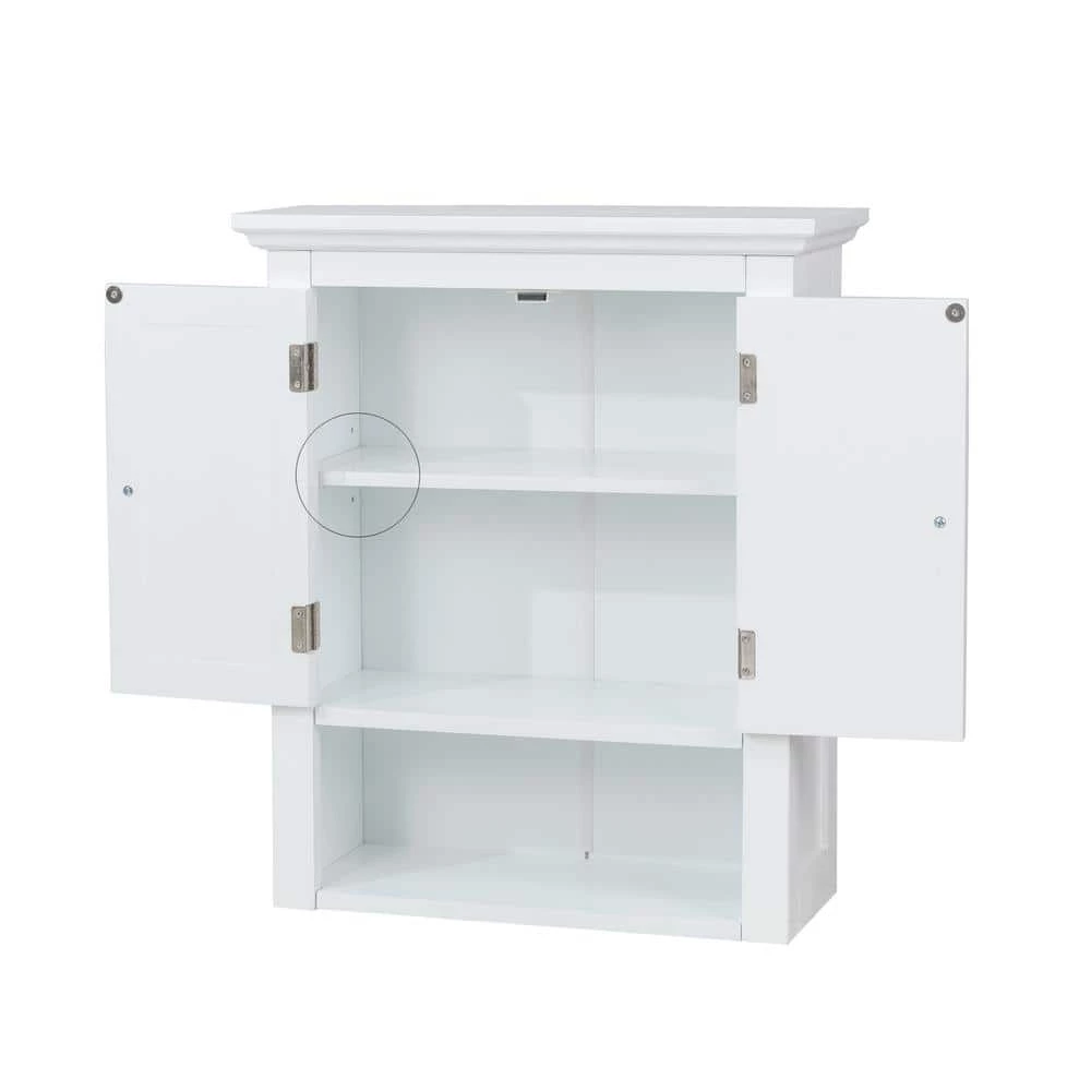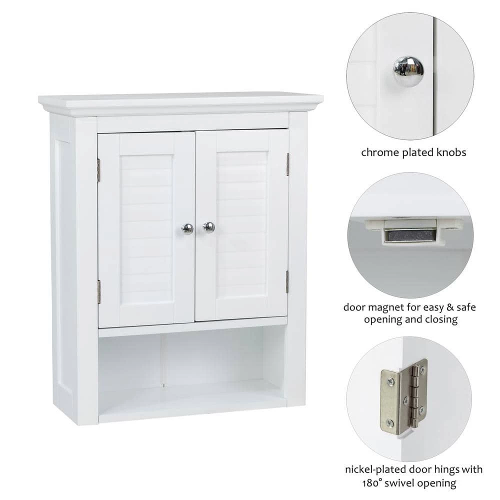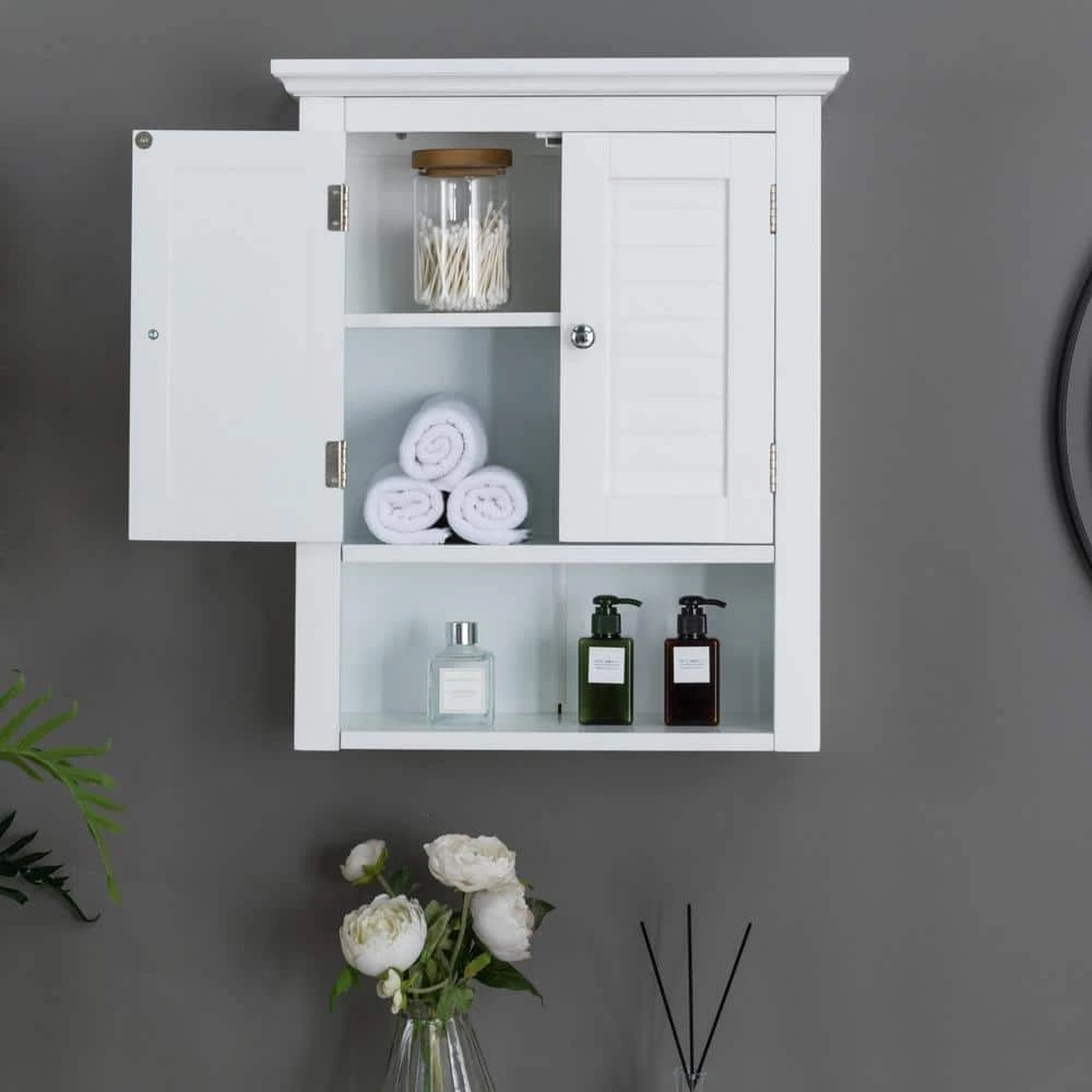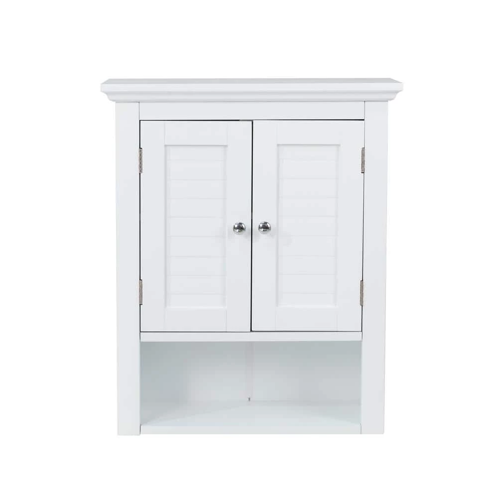 This Wooden Wall Storage Cabinet is an easy way to add space-saving storage and classy style to your bathroom. It is made of sturdy MDF wood and handcrafted with care. Above the towel bar, an open storage space allows you to use this wood bathroom cabinet to keep small toiletry items such as soaps, loofahs, additional washcloths, air fresheners or decorative items. A closed storage compartment gives you a place to keep other bathroom essentials. The white color and classic look allows it to fit in easily with a wide variety of bathroom decorating schemes.