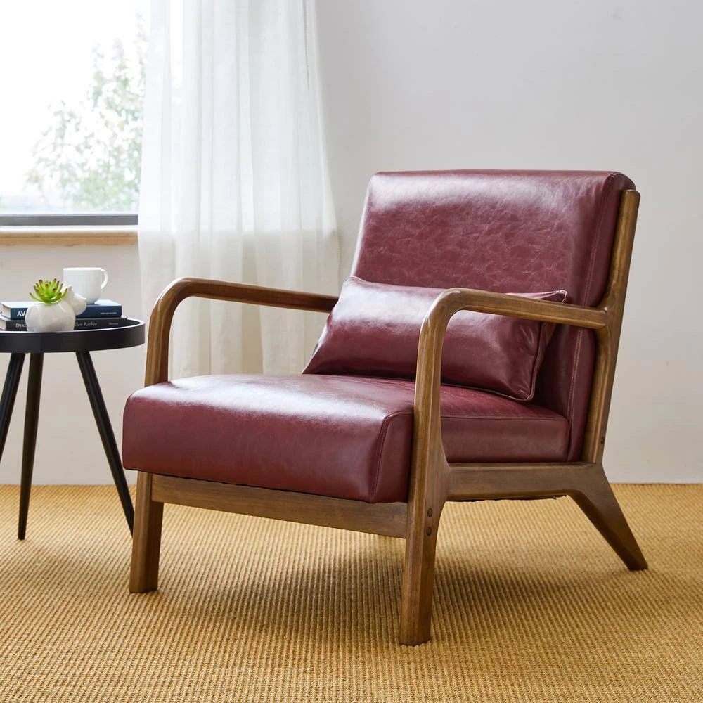 Accent chair is a great option for rounding out your seating arrangement with an extra seat that helps complement your space’s style, also a versatile piece that helps put the finishing on your home. This accent armchair features a sleek silhouette with a low-profile design founded on 4-tapered legs for a Mid-century Morden look. Made of a solid rubberwood frame with gorgeous walnut finish, and has a seat and back upholstered in PU leather with classic red color to give it a wonderful look.