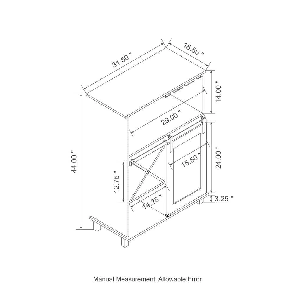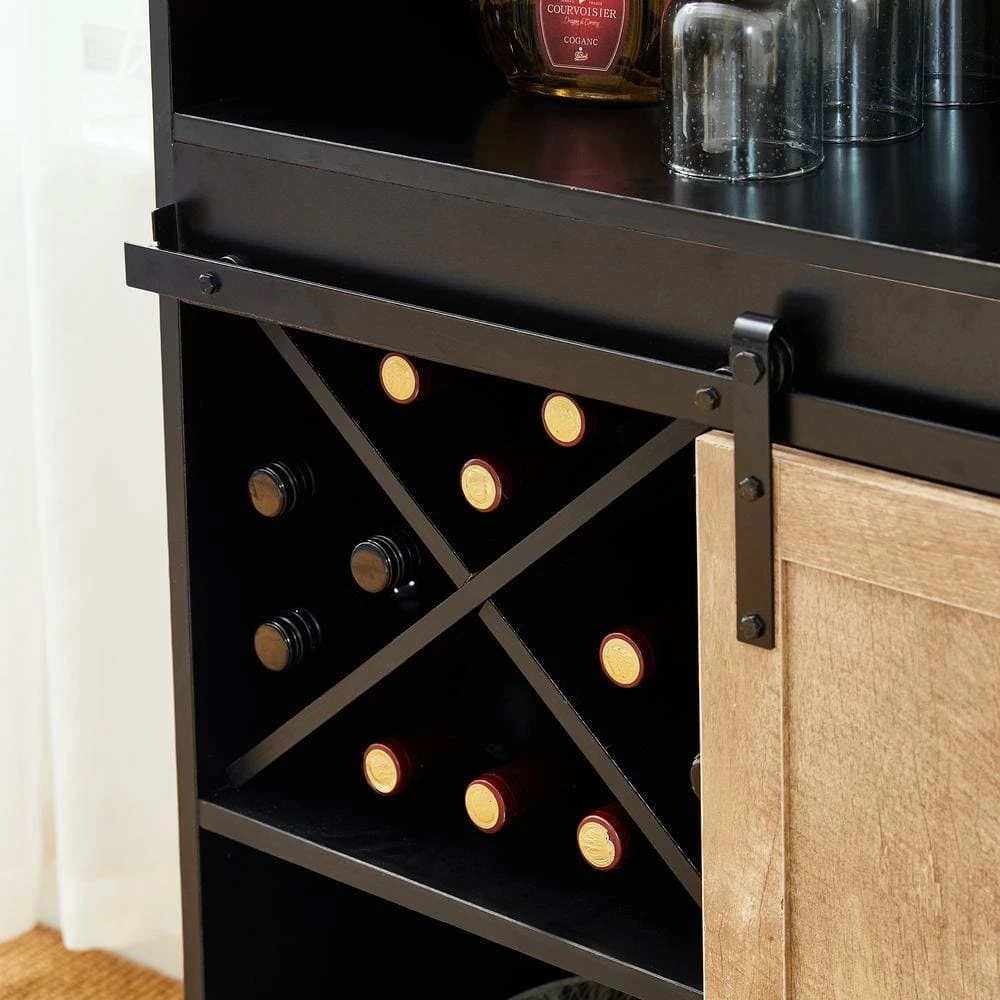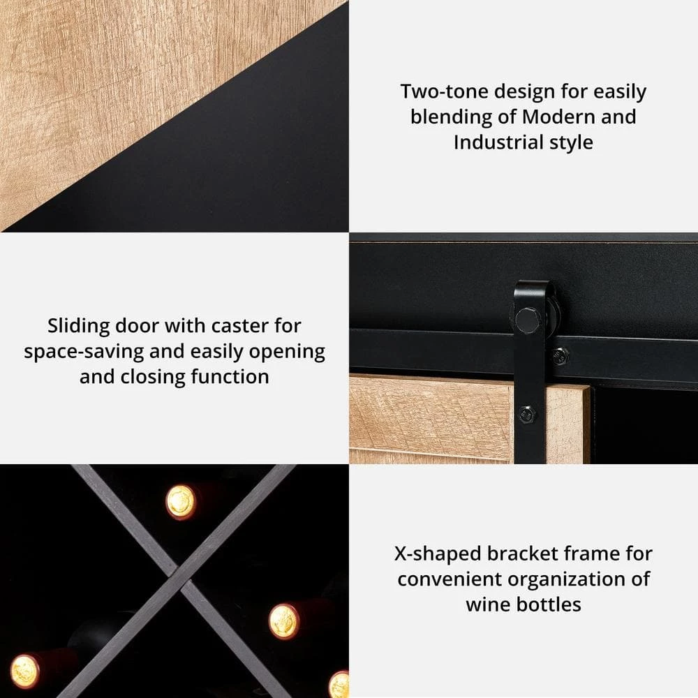 This two-toned abstract wine cabinet provides spacious storage for your dining accessories and wine collection. A built-in wine rack lets you store up to four bottles of your favorite wines, one sliding barn door open to reveal shelved storage for plates, serve ware, and handles of your preferred spirits, while one open upper shelf is great for showing off mugs. The wine glass hanging rack can display up to nine glasses.Not only easy on the eyes, but this smart wine cabinet is also flexible and functional with adjustable interior shelves for storage that fits your needs.