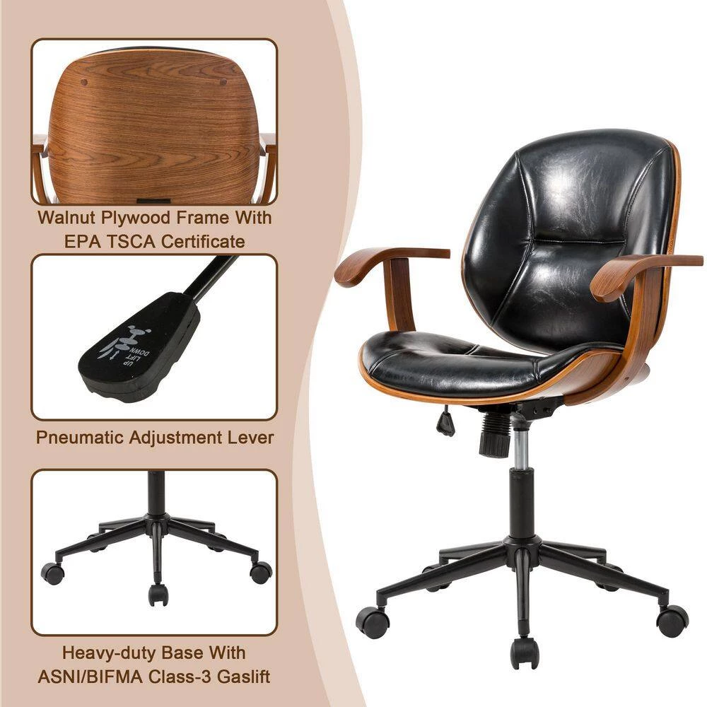 Oil wax leatherette upholstery with cushioned long stitched stripes on the seat and back give a mid-century modern and contemporary touch to your home office or workspace. 360-degree swivel and pneumatic adjustment lever will allow you to easily adjust the seat to your desired height. Ergonomic curved mid-back with walnut bentwood support, spacious padded seat and metal framed bamboo armrest, all promise the optimum comfort from discomfort caused by prolonged sitting while working or studying.