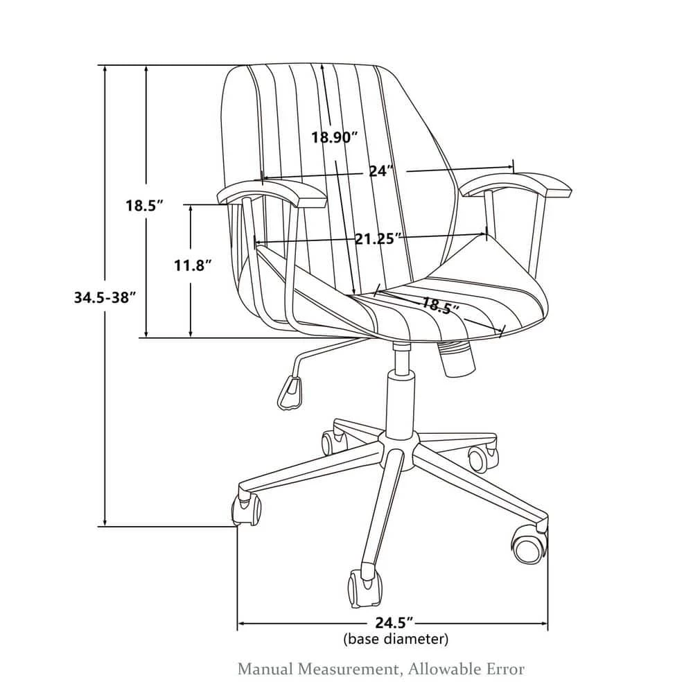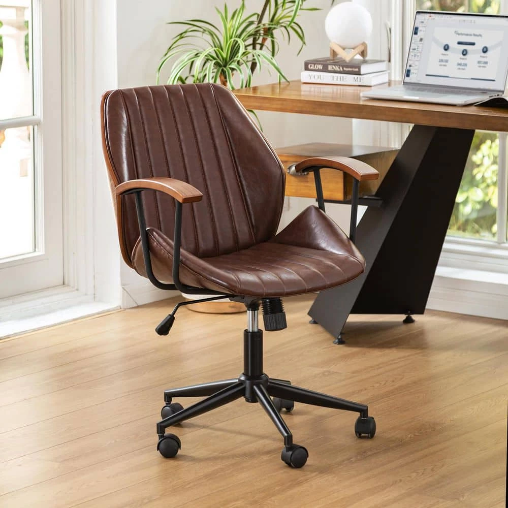 Oil wax leatherette upholstery with cushioned long stitched stripes on the seat and back give a mid-century modern and contemporary touch to your home office or workspace. Ergonomic curved mid-back with walnut bentwood support, spacious padded seat and metal framed bamboo armrest, all promise the optimum comfort from discomfort caused by prolonged sitting while working or studying. This office chair has heavy-duty base using five-jaw with ASNI/BIFMA Class-3 gaslift, plywood frame with EPA TSCA Certificate and foam inside is Flame Resistant with CA TB117-2013 Certificate.