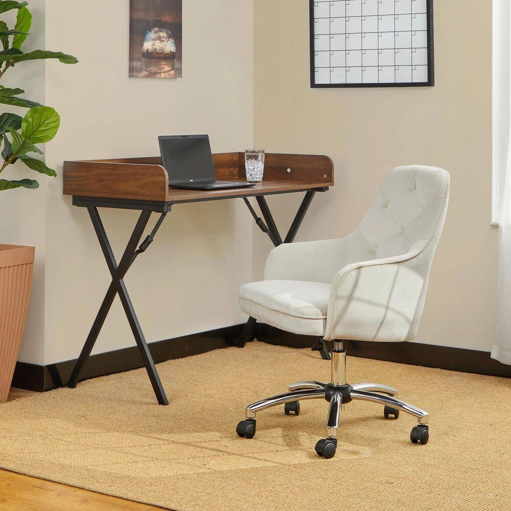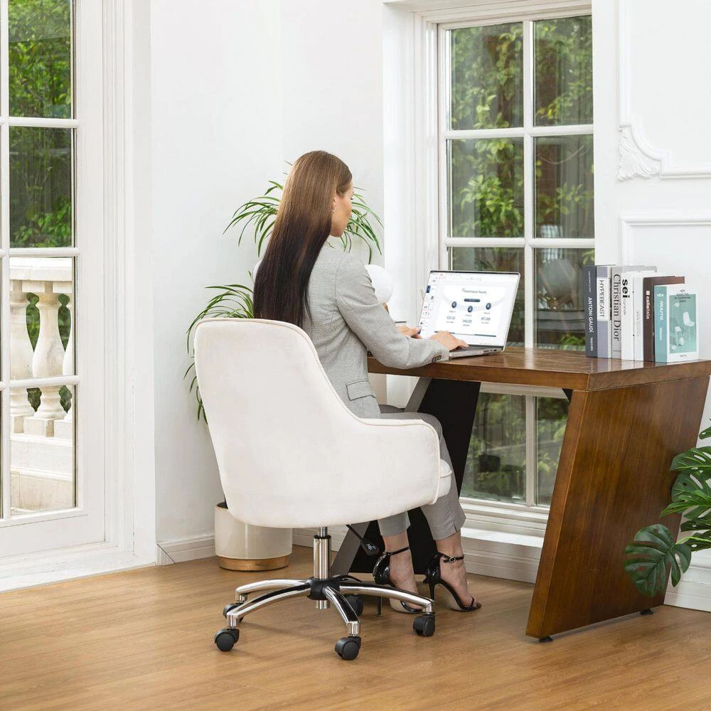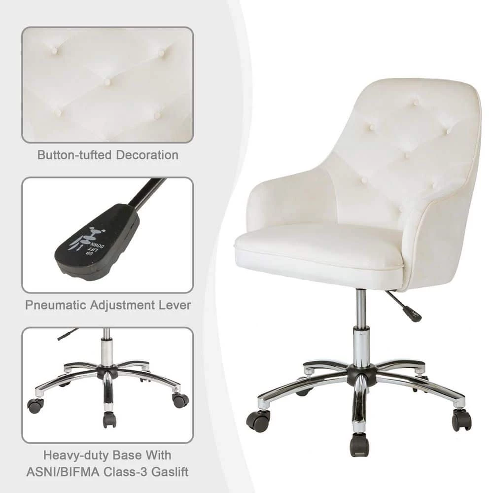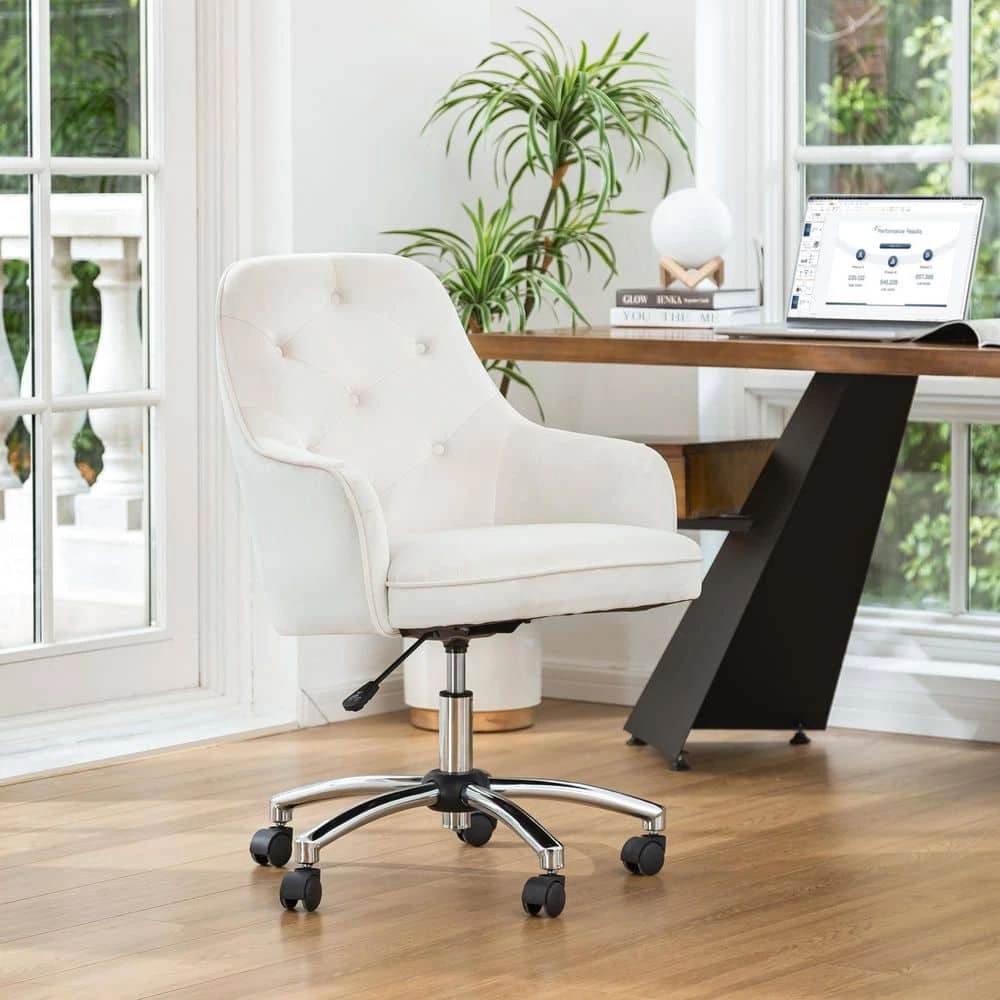 - It features white velvet fabric with a solid hue that adds a glam, modern touch to your home office.