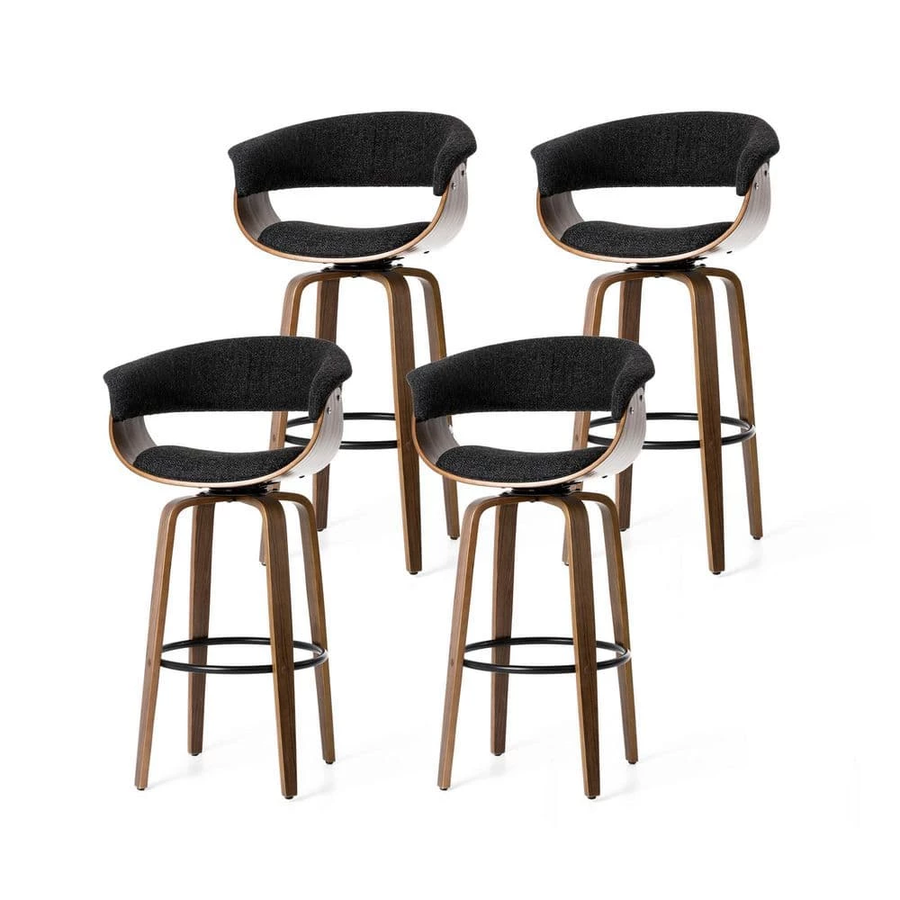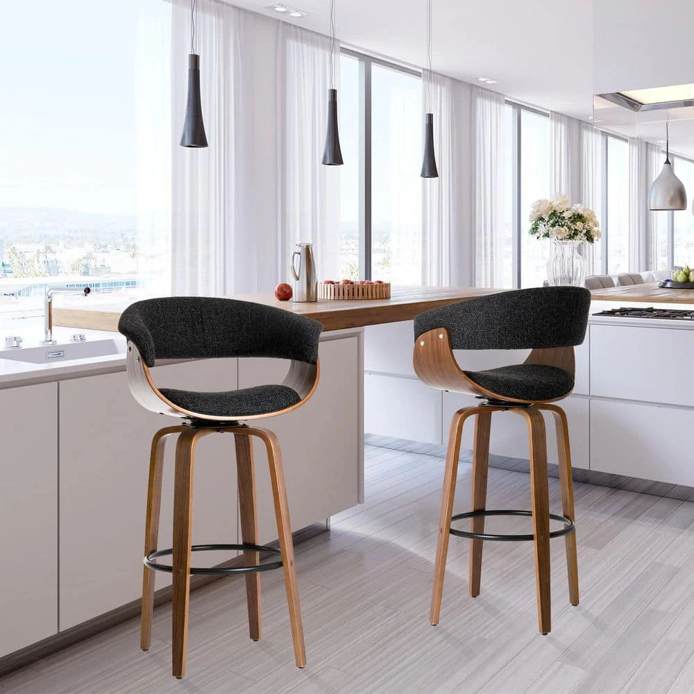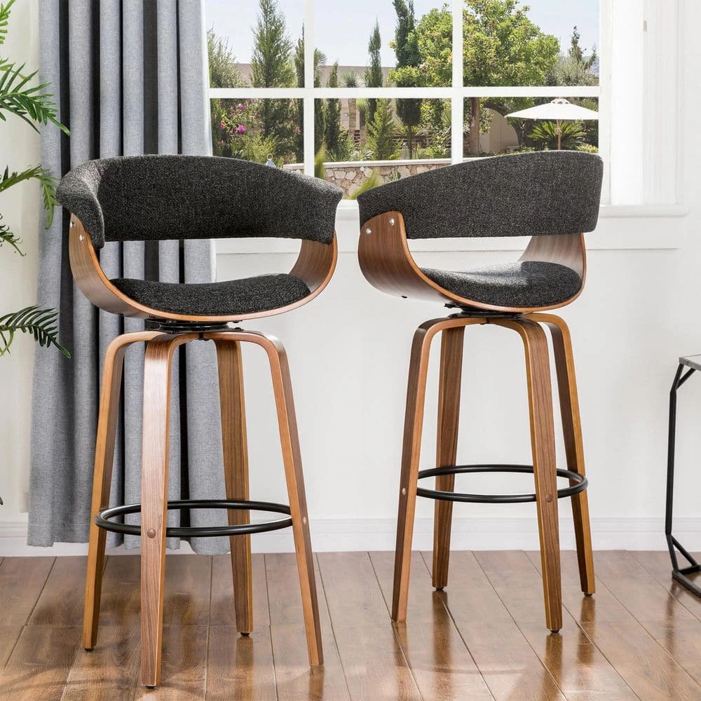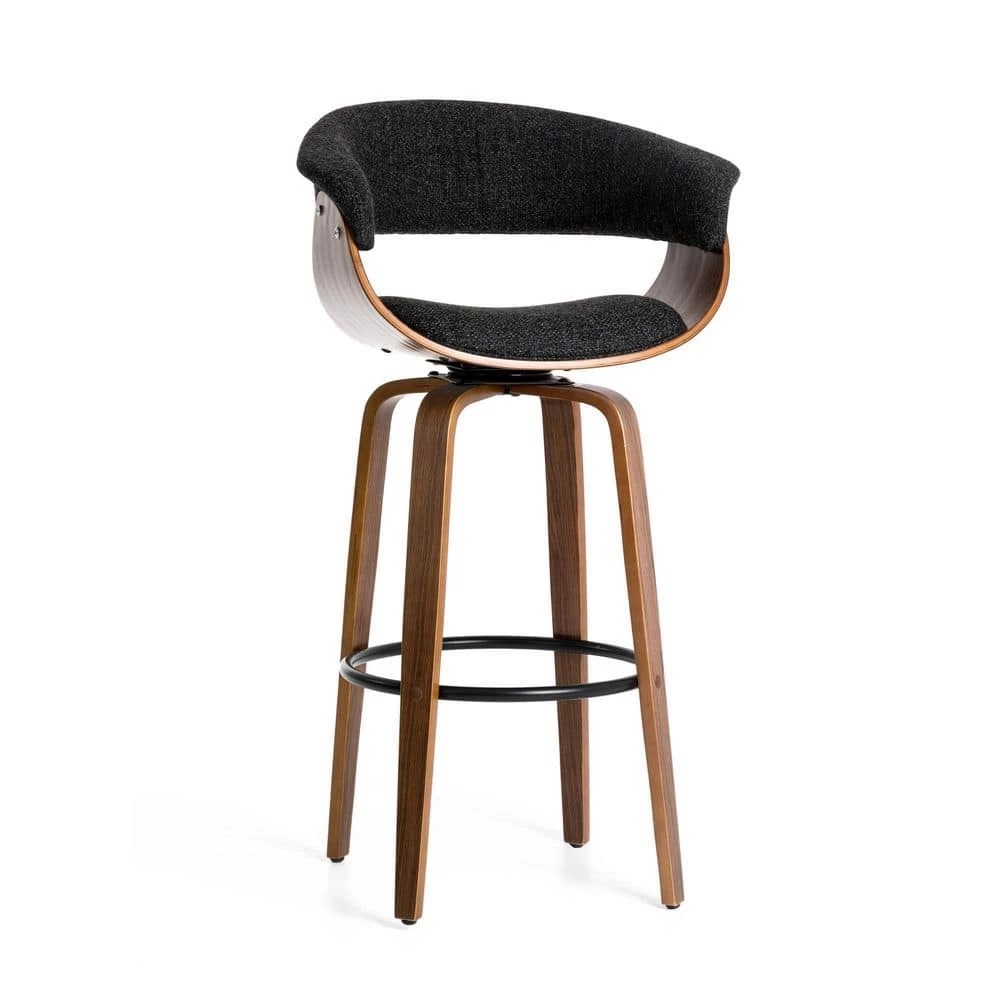 Take on your home a new look with this mid-century modern walnut bar stool. With a foam-padded seat and backrest, matte metal black footrest, this bar stool is made of a plywood frame. With a curvaceous dose of mid-century style, it features a bentwood finished stationary wood frame, luxuriously fabric upholstery, curved cushioned swivel seat, and stylish armrests with a 360° swivel mechanism. The 4 walnut-colored bentwood legs, with a built-in black powder coat or chrome, finished hoop footrest for comfort, making it suitable for any pub table or kitchen island with this curated bar stool. The beautiful natural walnut wood grain veneer is perfectly accented by its upholstered seat and back. This bar stool is wonderfully versatile, sporting a stylish yet practical appearance as well as a 360° swivel function for exceptional mobility.