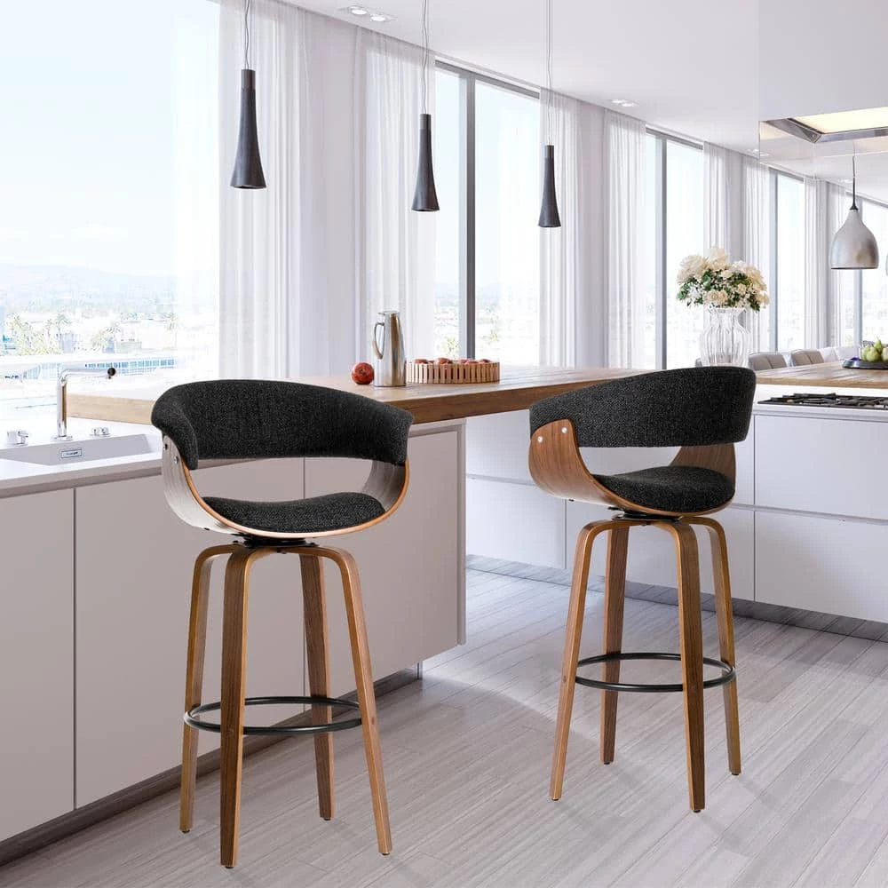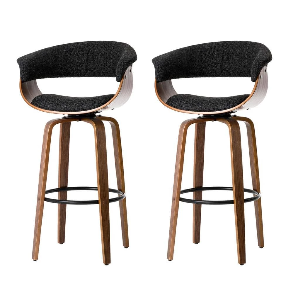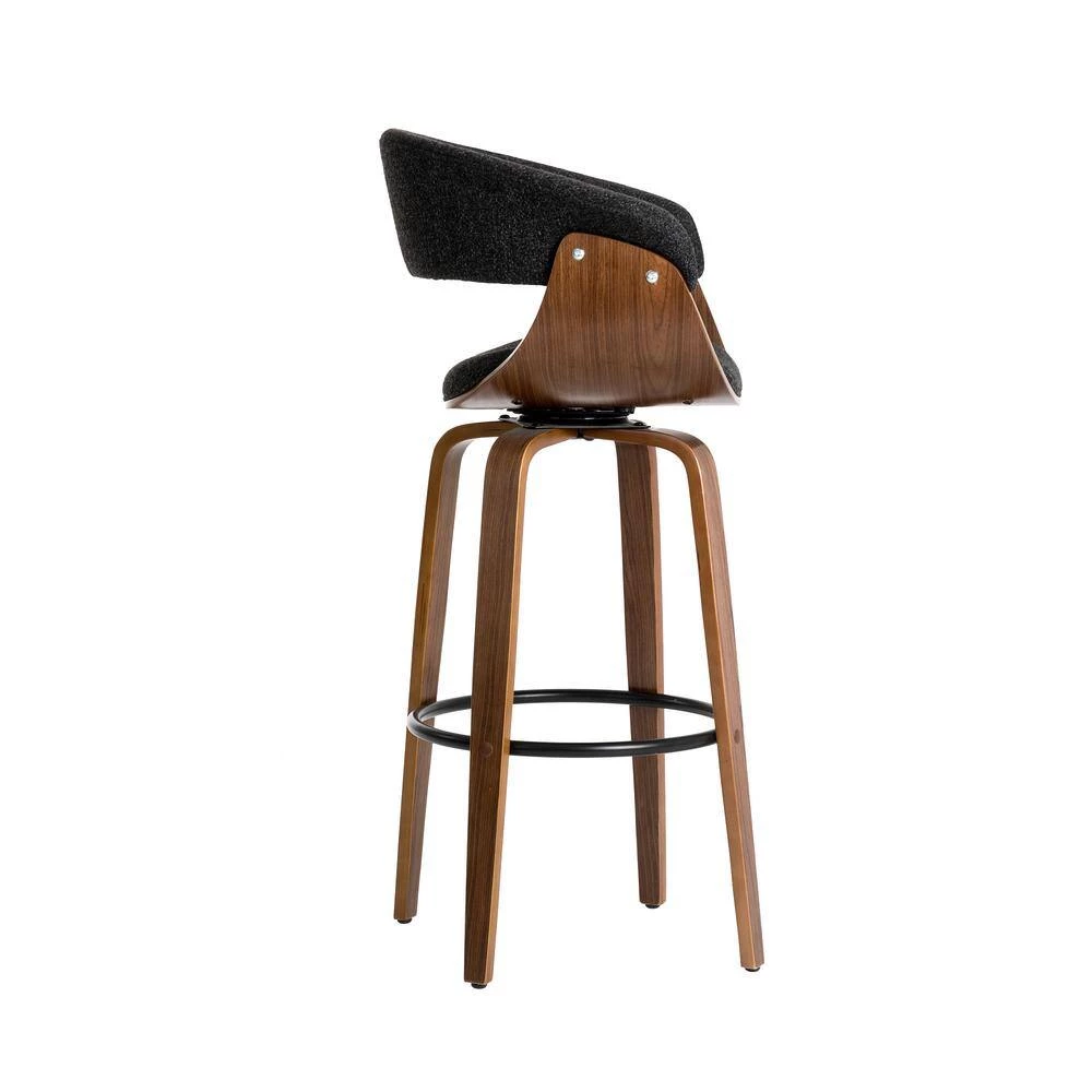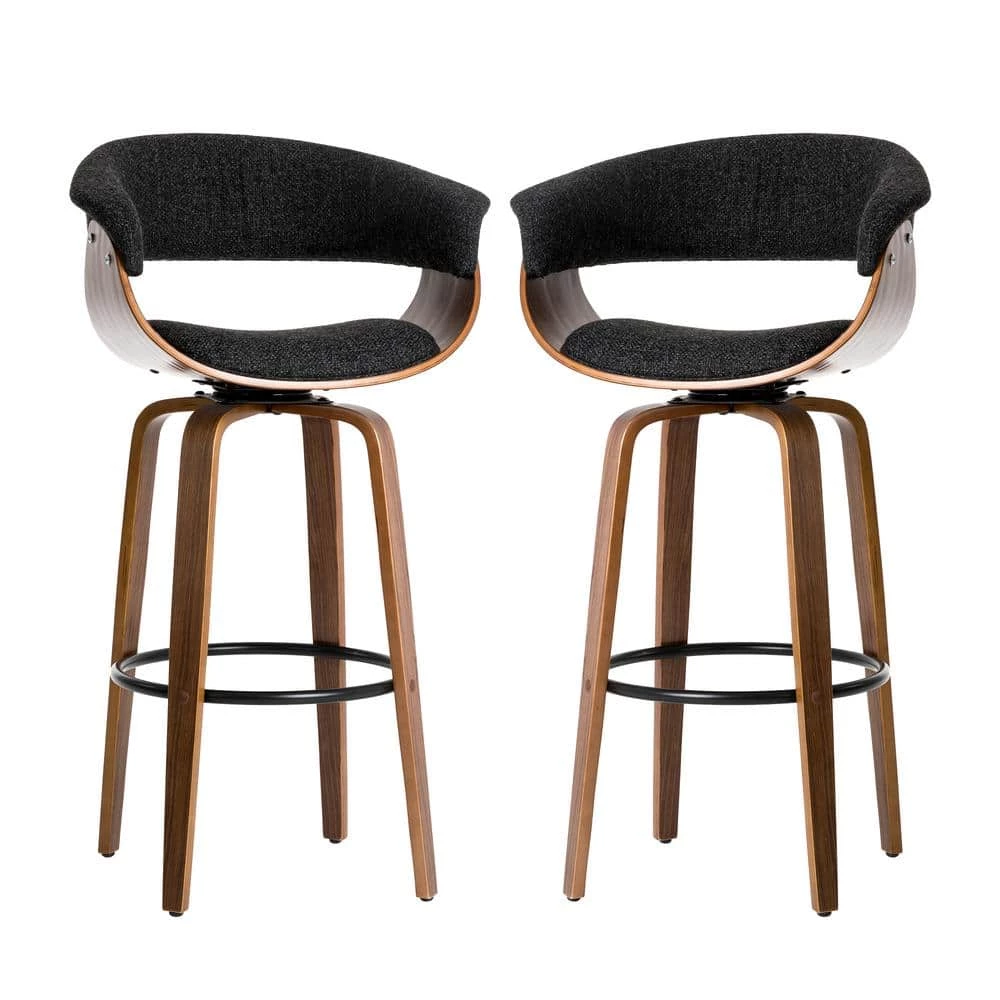 Take on your home a new look with this mid-century modern walnut bar stool. With a foam-padded seat & backrest, matte metal black footrest, this bar stool is made of a plywood frame. With a curvaceous dose of mid-century style, it features a bentwood finished stationary wood frame, luxuriously fabric upholstery, curved cushioned swivel seat, and stylish armrests with a 360-degree swivel mechanism. The four walnut-colored bentwood legs, with a built-in black powder coat or chrome, finished hoop footrest for comfort, making it suitable for any pub table or kitchen island with this curated bar stool! The beautiful natural walnut wood grain veneer is perfectly accented by its upholstered seat and back. This bar stool is wonderfully versatile, sporting a stylish yet practical appearance as well as a 360-degree swivel function for exceptional mobility.