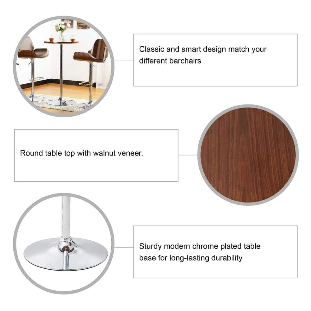 This bar table exquisitely matches the elegance of your stylish dining room, kitchen, or bar. The sleek design gives you the flexibility to move around easily. The table-top is made of thickened MDF board and covered with wonderful solid walnut veneer. The leg and base are made of iron and chromed finished for rust resistance. This heavy-duty table is supported by a strong iron rod and a large base, offering a weight capacity of up to 200 lbs. so the table is as high-quality as it is elegant and modern, this bar table is a perfect addition to your kitchen or Bar room.