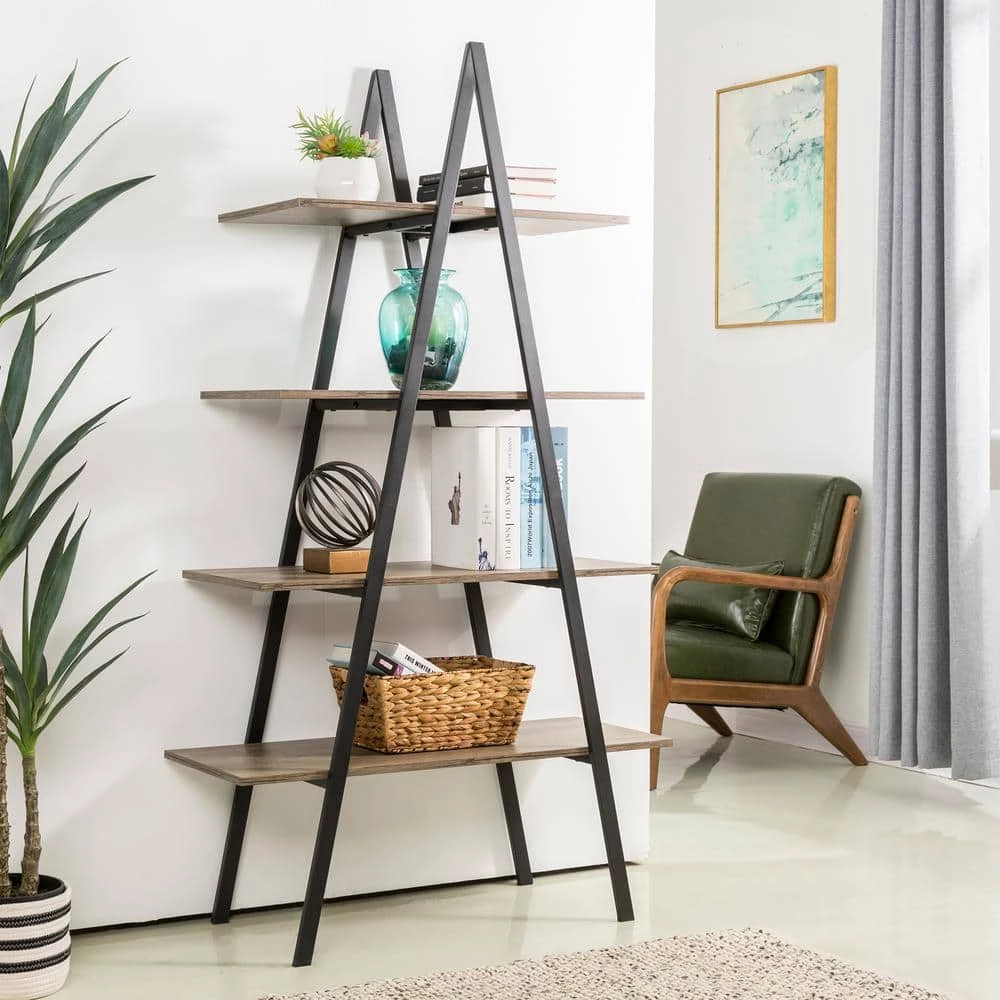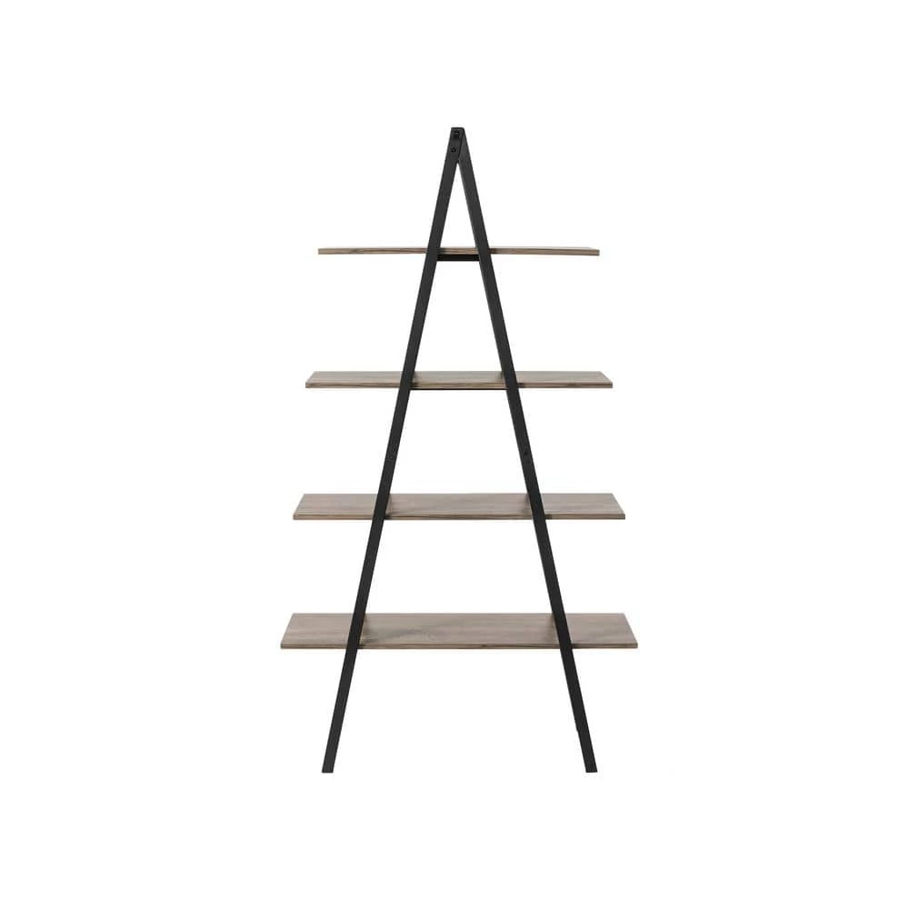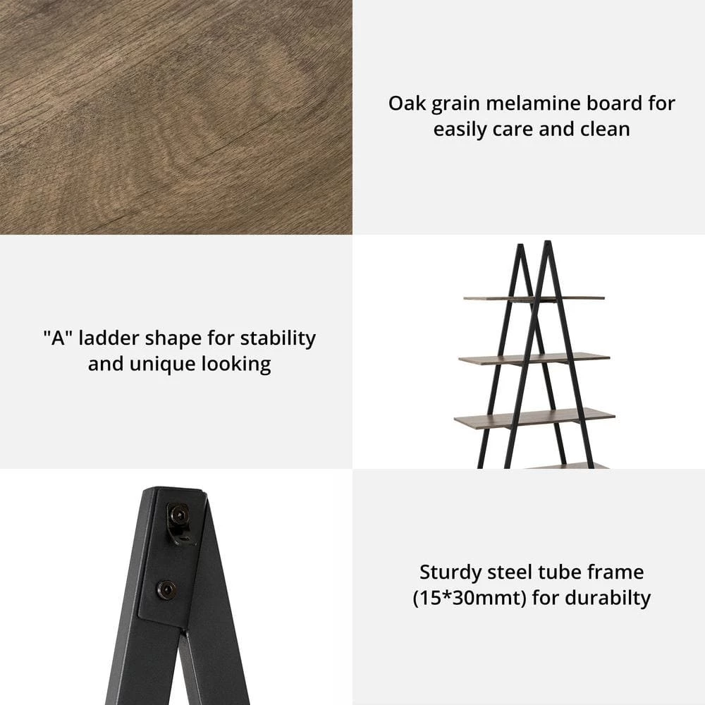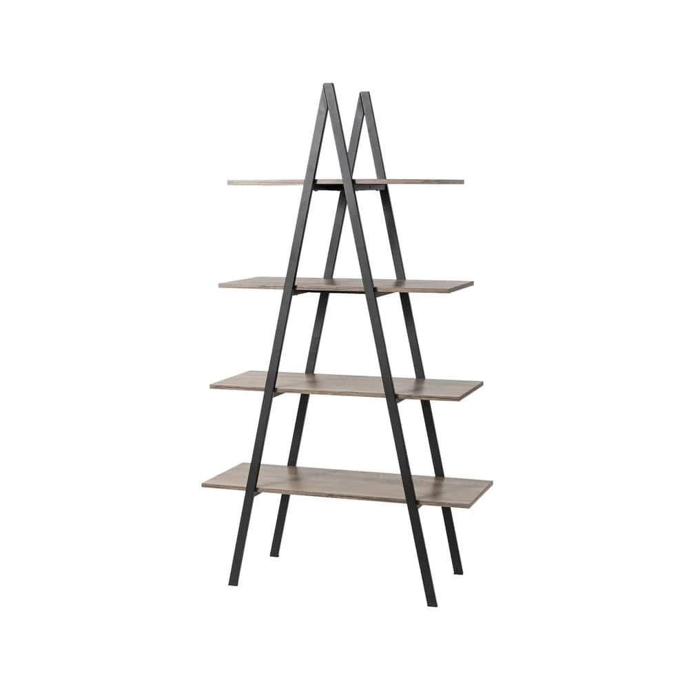 Organize your space with dynamic items like 4-Tiered Industrial Shelf. This minimalist shelf piece features a 4-tiered construction with melamine bases in a black wood grain appearance. Each tier of the shelf is connected and held by brown metal trims that makes up the frame as well, and each level of the shelf is secured by connective bolts. Use this floor piece to display photo frames, books, decor, and more.