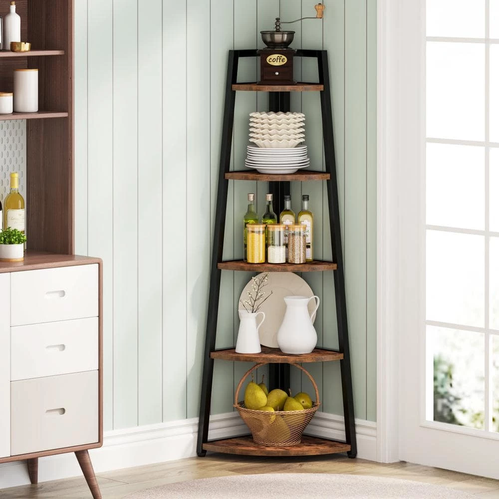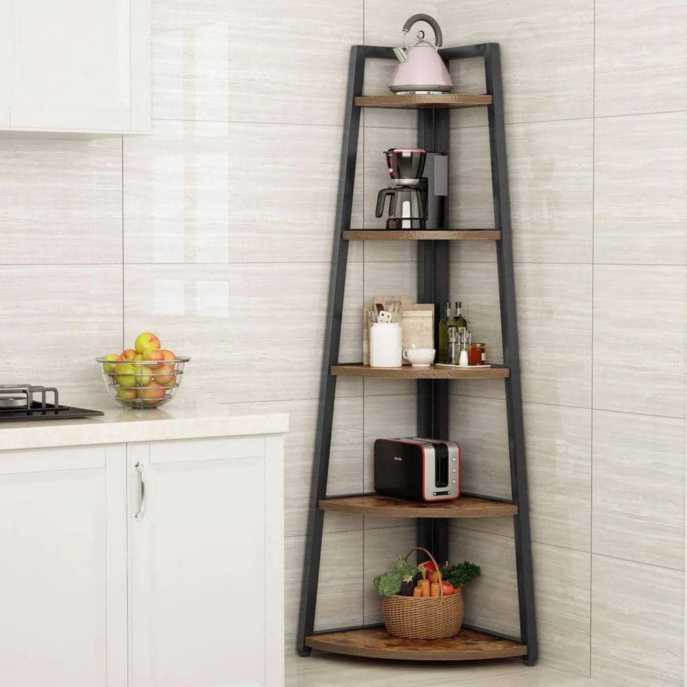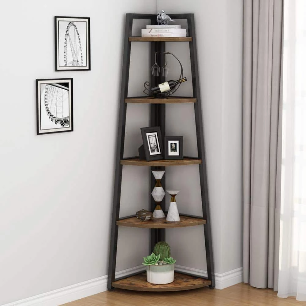 Crafted from solid metal frame and durable particle boards, the rustic corner shelf stand is quite robust and durable, lasting for long-term use. 5-tier fan-shaped shelves in round edge and anti-toppling fittings on the top layer can protect your family from potential injury. Plastic pads on the feet can also prevent your floor from scratching.