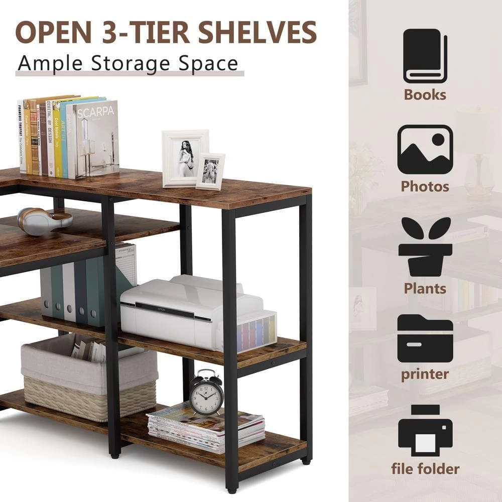 The L-shaped desk will maximize your workspace. The riser shelf can easily hold 2 monitors, printers and other devices.A spacious desktop allows you to create more freely.Besides,the side opens shelf keeping everything you need at work within reach.