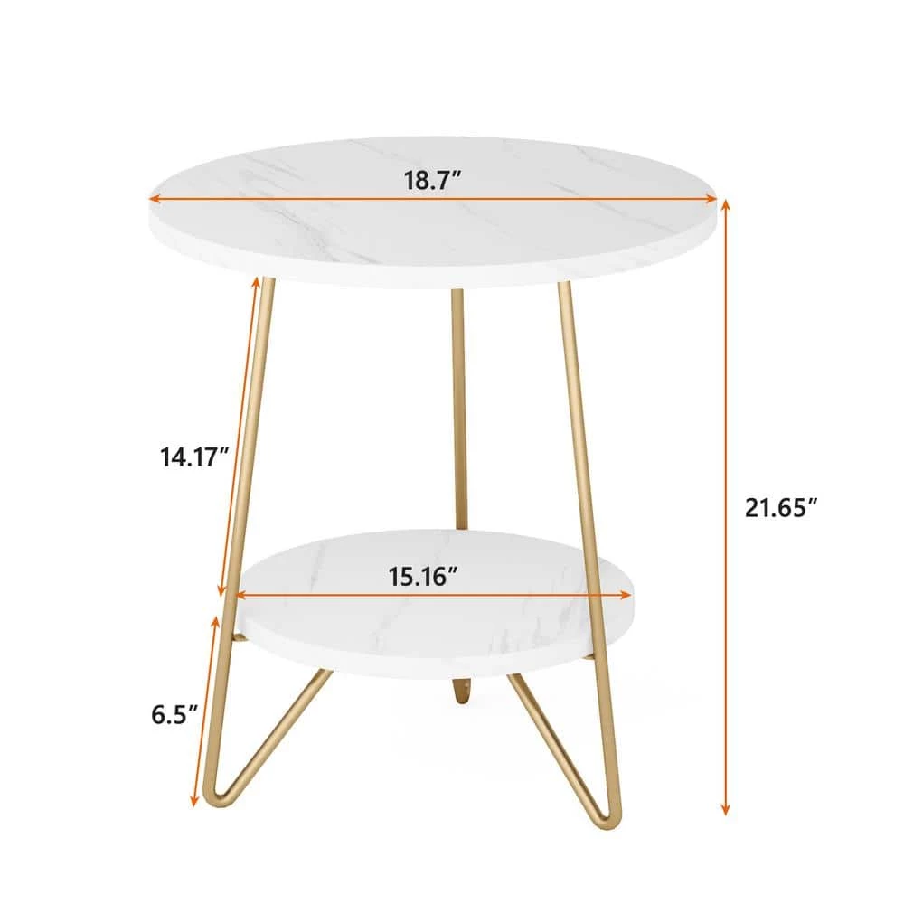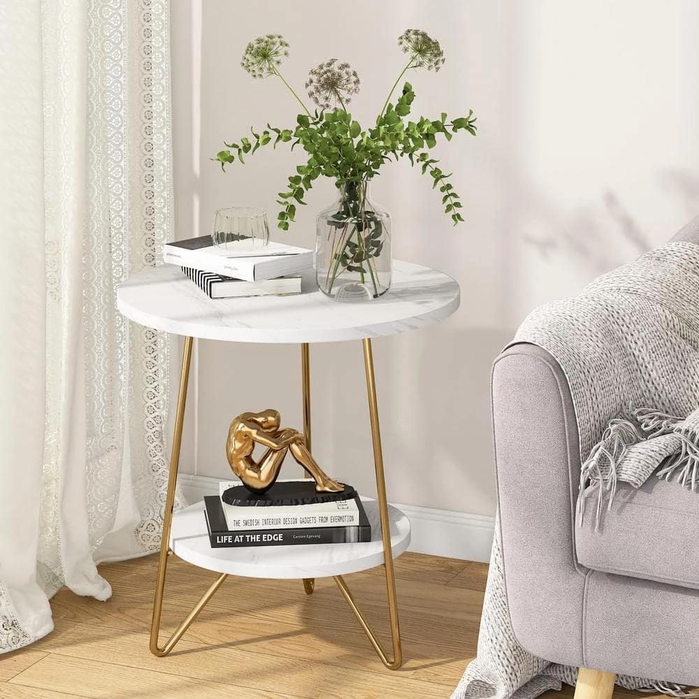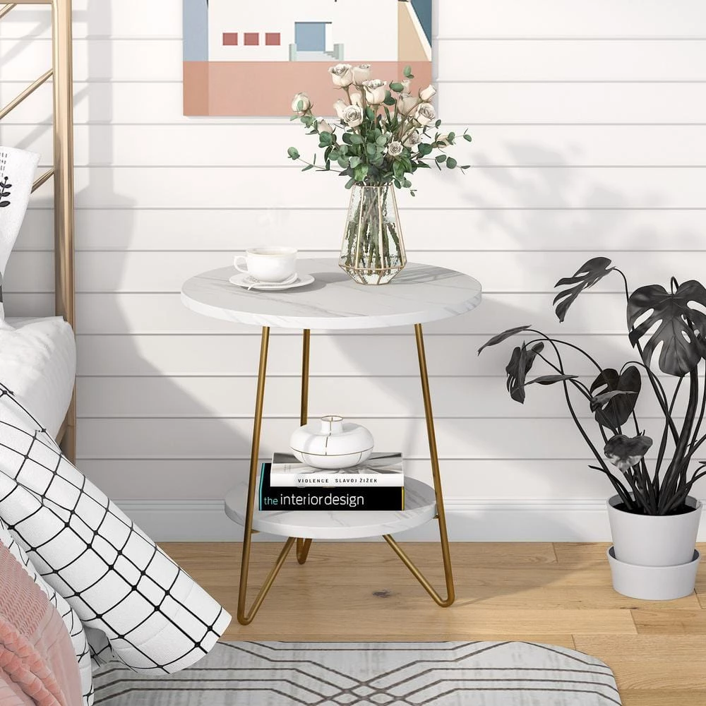 With its clean lines and open frame, this round end table brings a touch of airy, accent tables with open shelves, which are ideal places to house everyday items such as remote controls, magazines and books. Fusing durability with a modern-contemporary look, this round end table serves as a modest yet elegant living room. It features a two-tier faux marble design in a white hue with gray veining and a golden-hued metal frame for mixed-media appeal. Simple and stylish appearance is perfect for different decor, can be widely used in living room, bedroom, office, college dorm and other places. Suitable as a chair side table, sofa table, nightstand, coffee table, snack table or as indoor plant stand table.