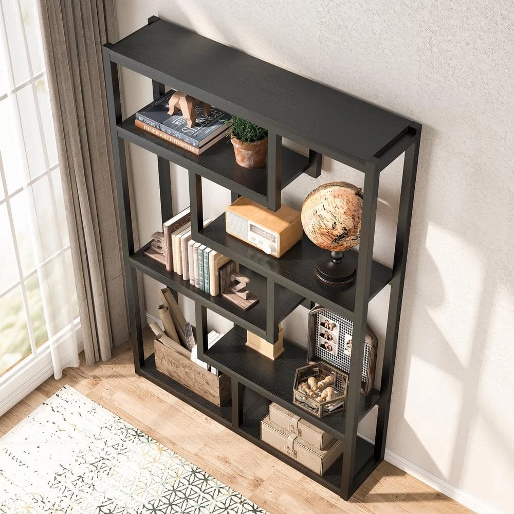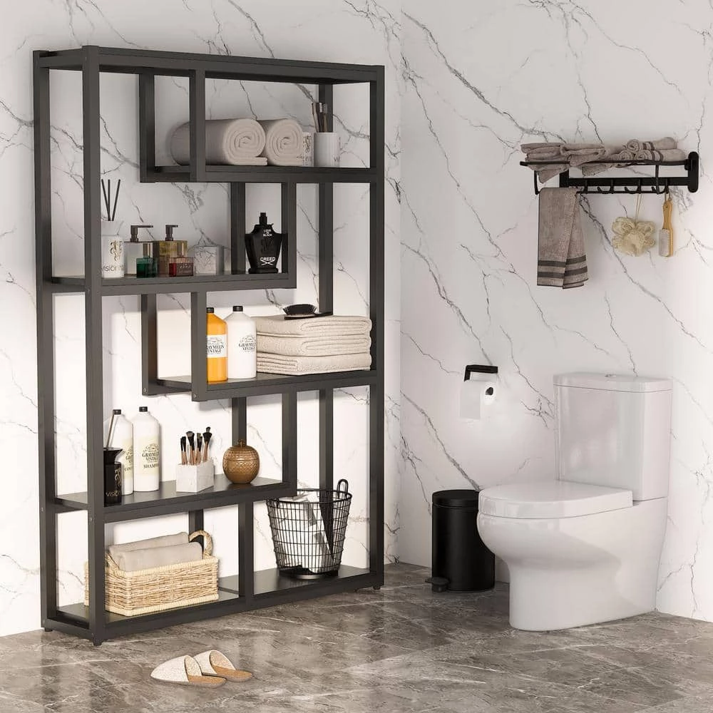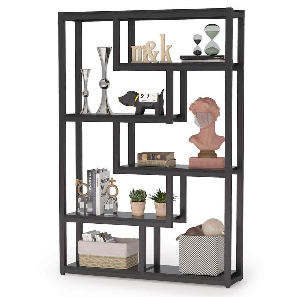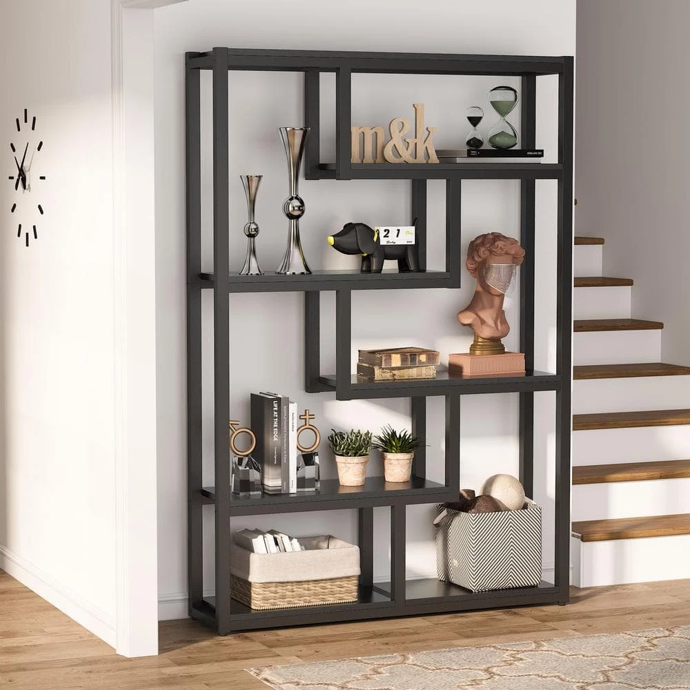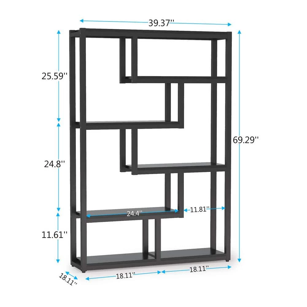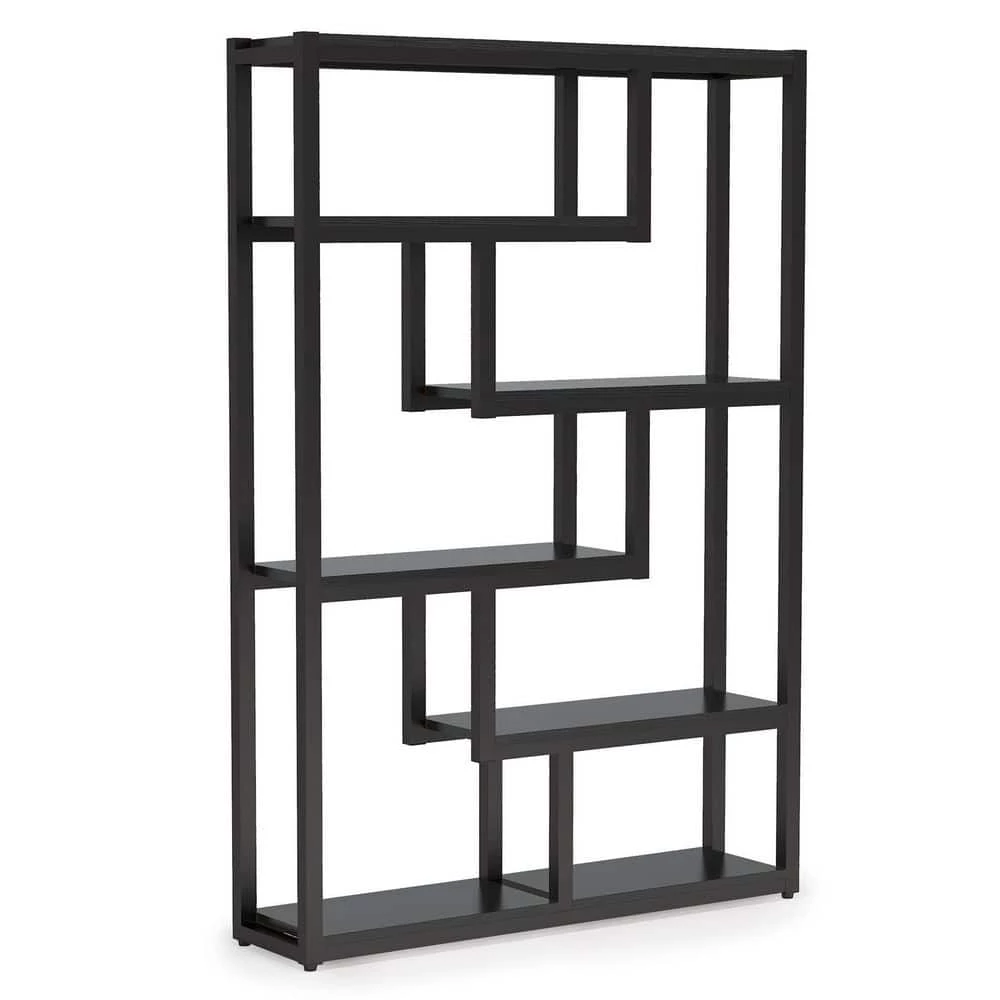 Combining a modish design with organizing features, this etagere bookshelf will maximize the functionality in your space. Taggered shelves allow you to view display items from all sides. Featuring wood grain color shelves and black metal frame, this piece creates a beautiful balance of industrial style and pragmatism.