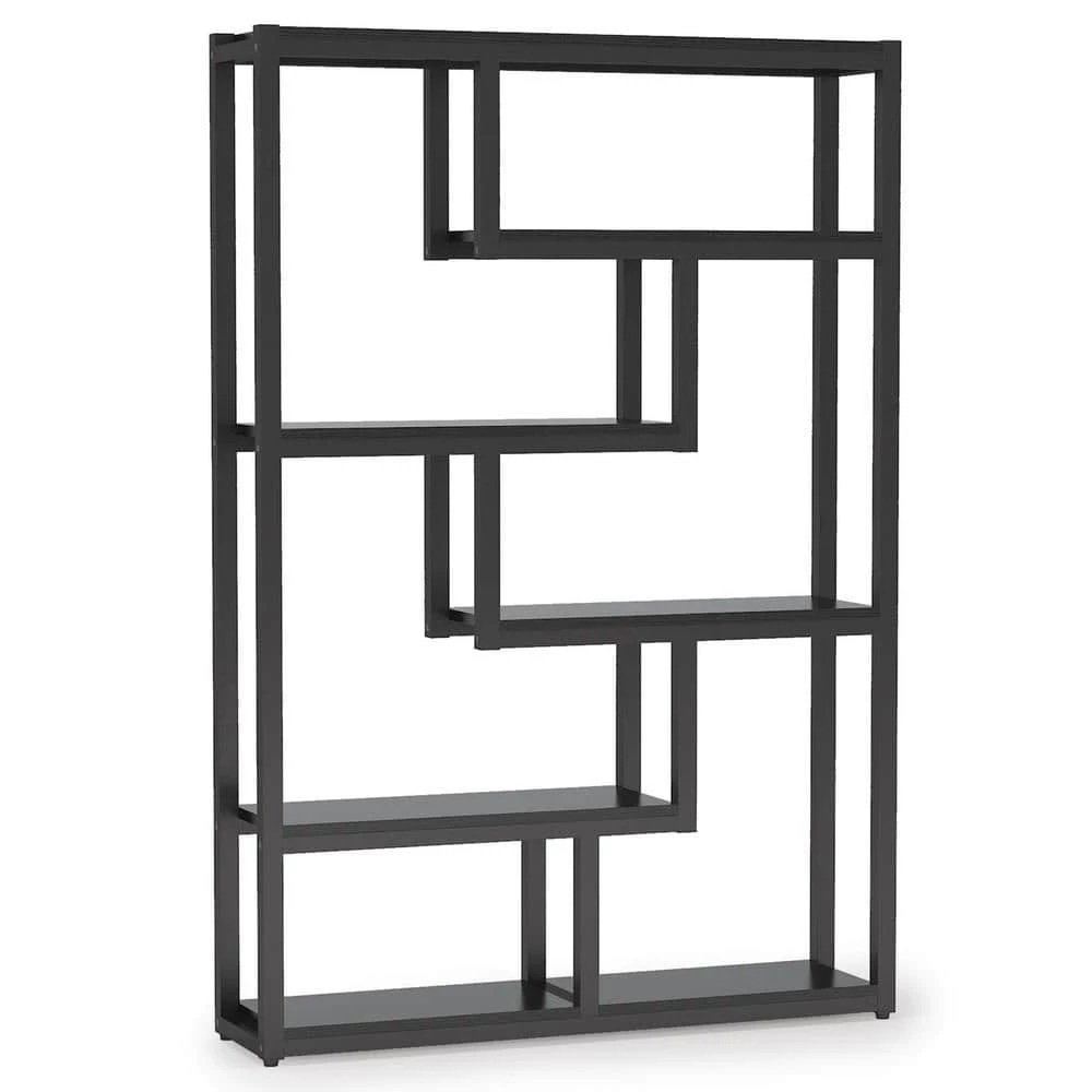 Combining a modish design with organizing features, this etagere bookshelf will maximize the functionality in your space. Taggered shelves allow you to view display items from all sides. Featuring wood grain color shelves and black metal frame, this piece creates a beautiful balance of industrial style and pragmatism.
