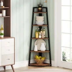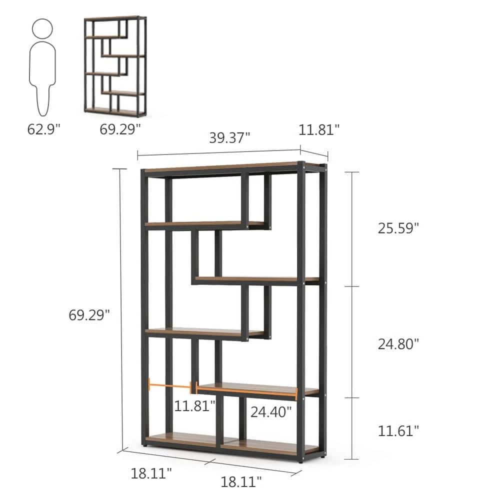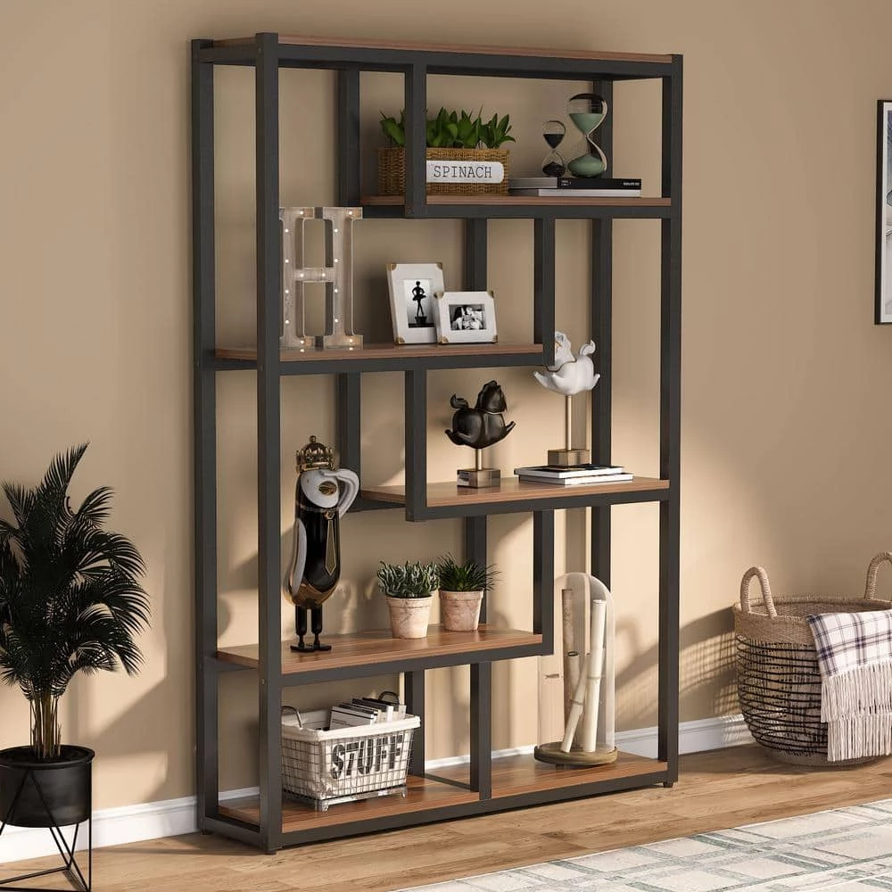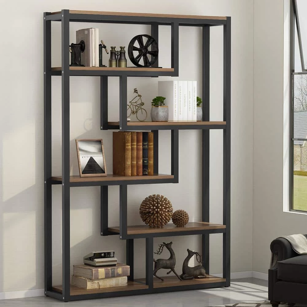 Combining a modish design with organizing features, this etagere bookshelf will maximize the functionality in your space. Taggered shelves allow you to view display items from all sides. Featuring wood grain color shelves and black metal frame, this piece creates a beautiful balance of industrial style and pragmatism.