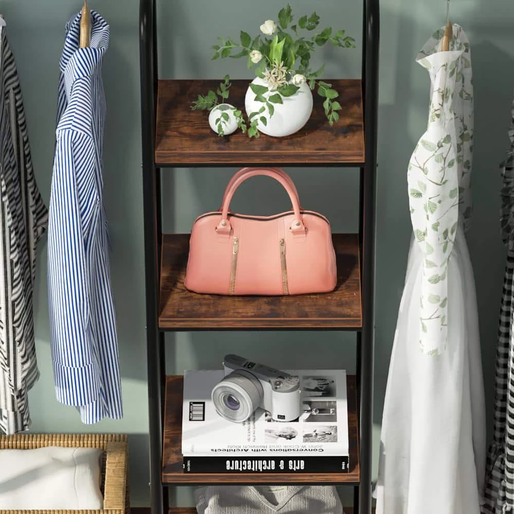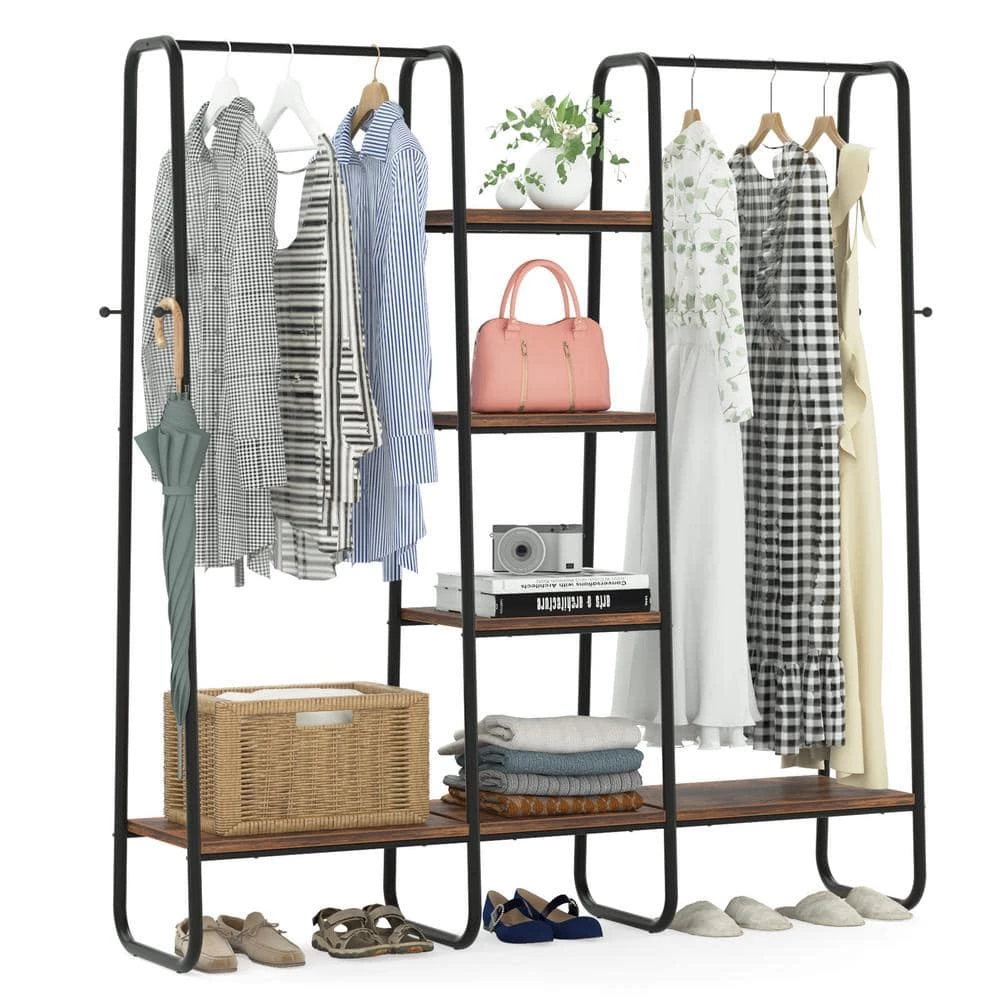 This retro brown and black coat racks feature 4 open storage shelves, 2 hanging rods and 4 hanging hooks which is the perfect clothes rack for bedroom, laundry room and cloakroom. The retro brown and black color give this rack farmhouse and vintage charming, easily integrate with any kind of home decoration and furniture. The open shelves offer place for jeans, the hanging rods provide suitable place for crease-prone shirts, skirts and coats, while the hanging rods in both right side and left side is the home for begs and hats. You will not regret to have this generous and practical coat racks.