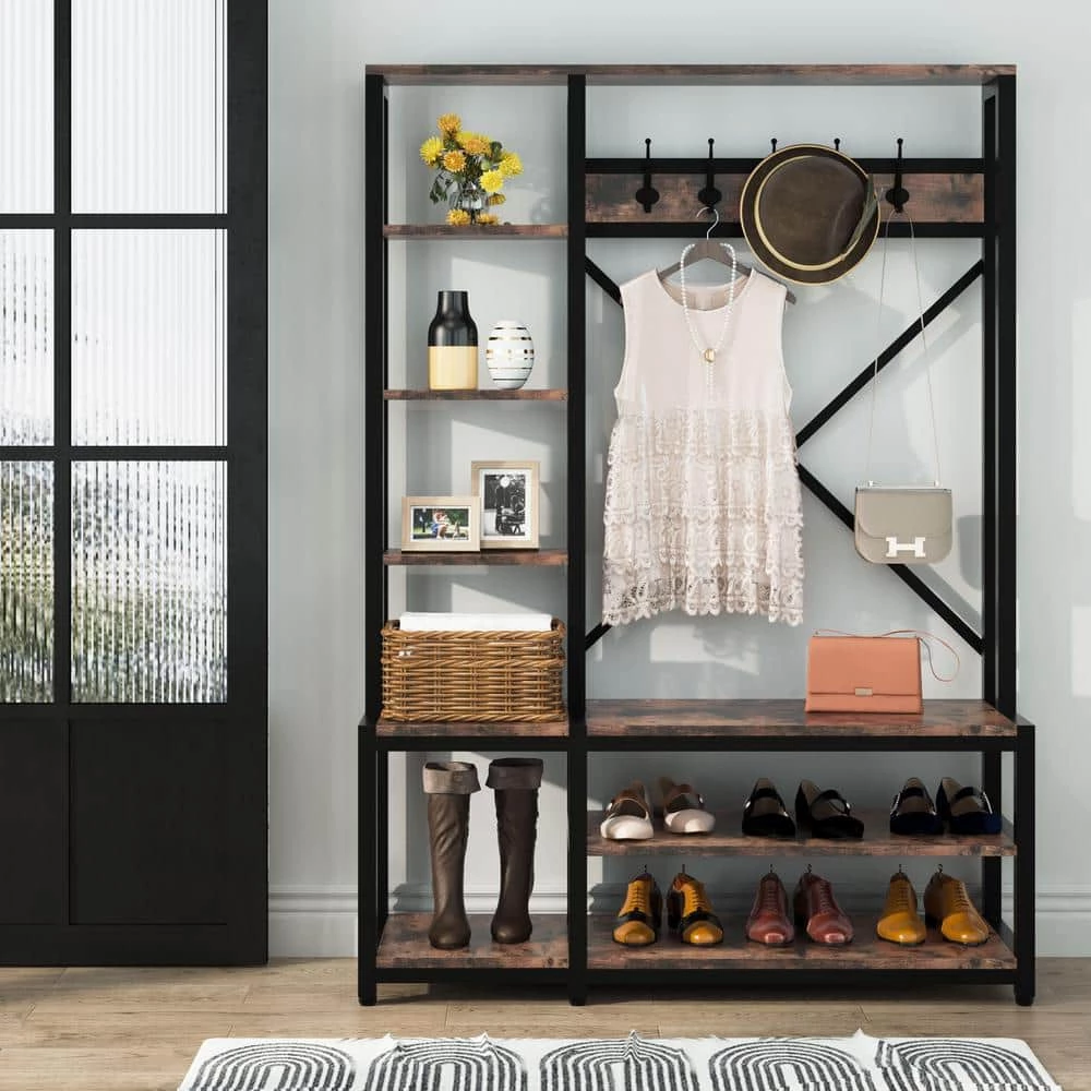 Are you still looking for a place to put your shoes? Are you tired of throwing overcoats on the nearest chair, taking up much-needed space? Are you still complaining that you have nowhere to sit and take off your boots? Our hall tree with benche, coat rack and storage rack will provide you with comfortable seats, as well as a high shoe rack and two low shoe racks for storing more shoes and 5 hooks for organizing clothes. This hall tree adopts a stylish industrial design, with rustic wooden elements, which is very suitable for any home decor. Place handbag on the wooden shelf, hang hat and clothes on the hooks and garment rod, sit on the bench to remove your shoes and put them on the shoe rack comfortably when you back home.