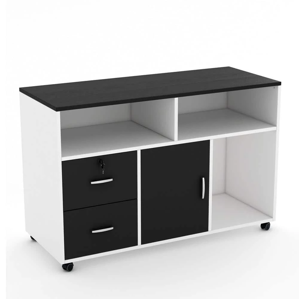 Wooden file cabinet with 2 drawers and open shelves, designed for home office organized. The sleek and modern finish, smooth surface and classical appearance matches other wooden furniture, which is an easy fit for home study or office. This filing cabinet is designed to keep the office machines, paper, files and supplies organized. It can be fixed beside or under desk.