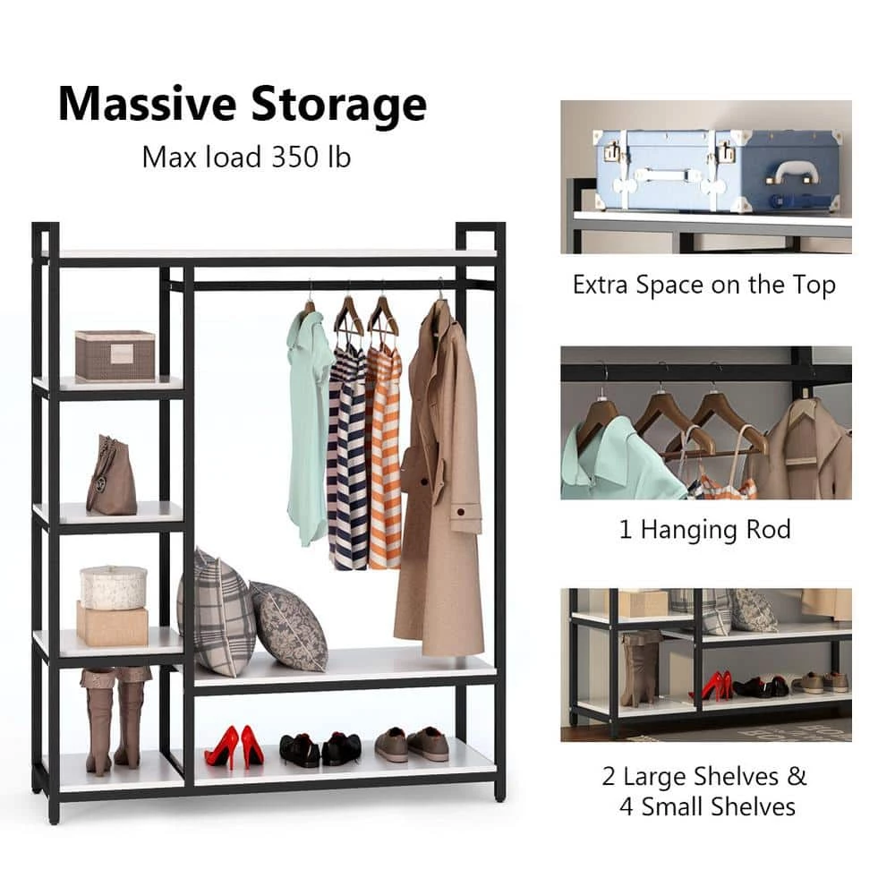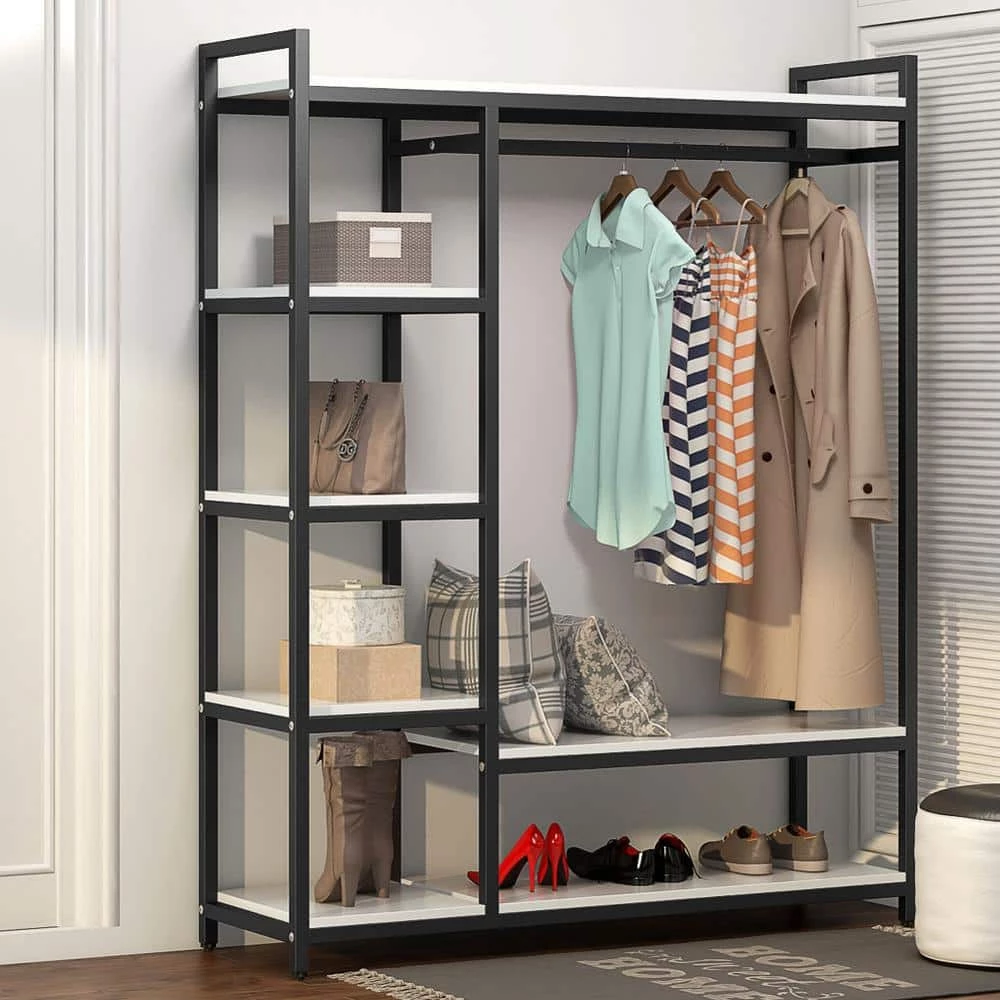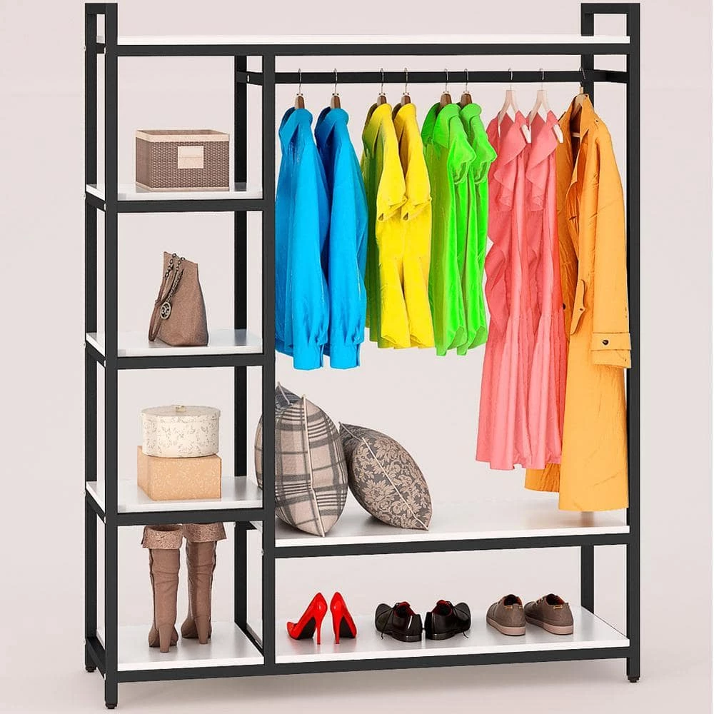 - 2 large shelves and 4 small ones ensure you plently of room to place clothes, accessries, shoes etc. the garment rods hold up 50 lb. for hanging your dress and suits, and put large box on the top for added storage