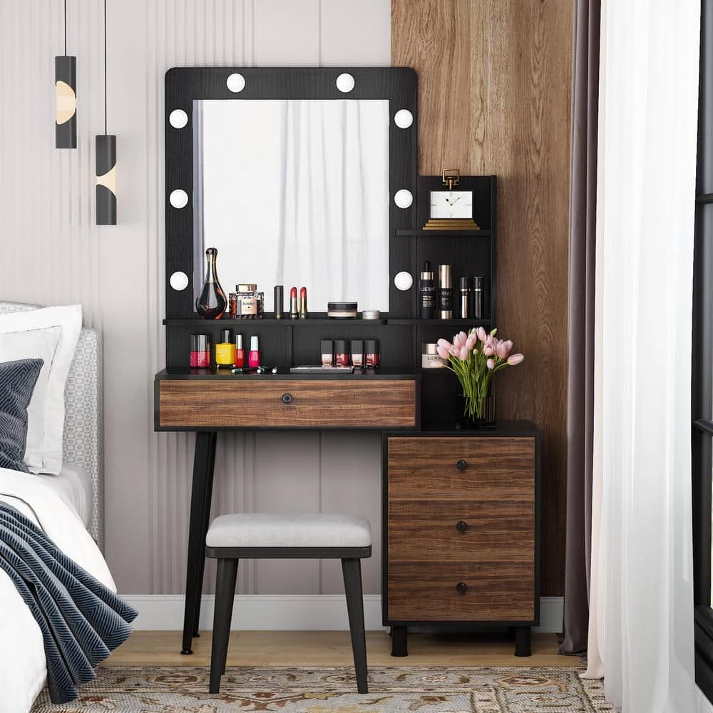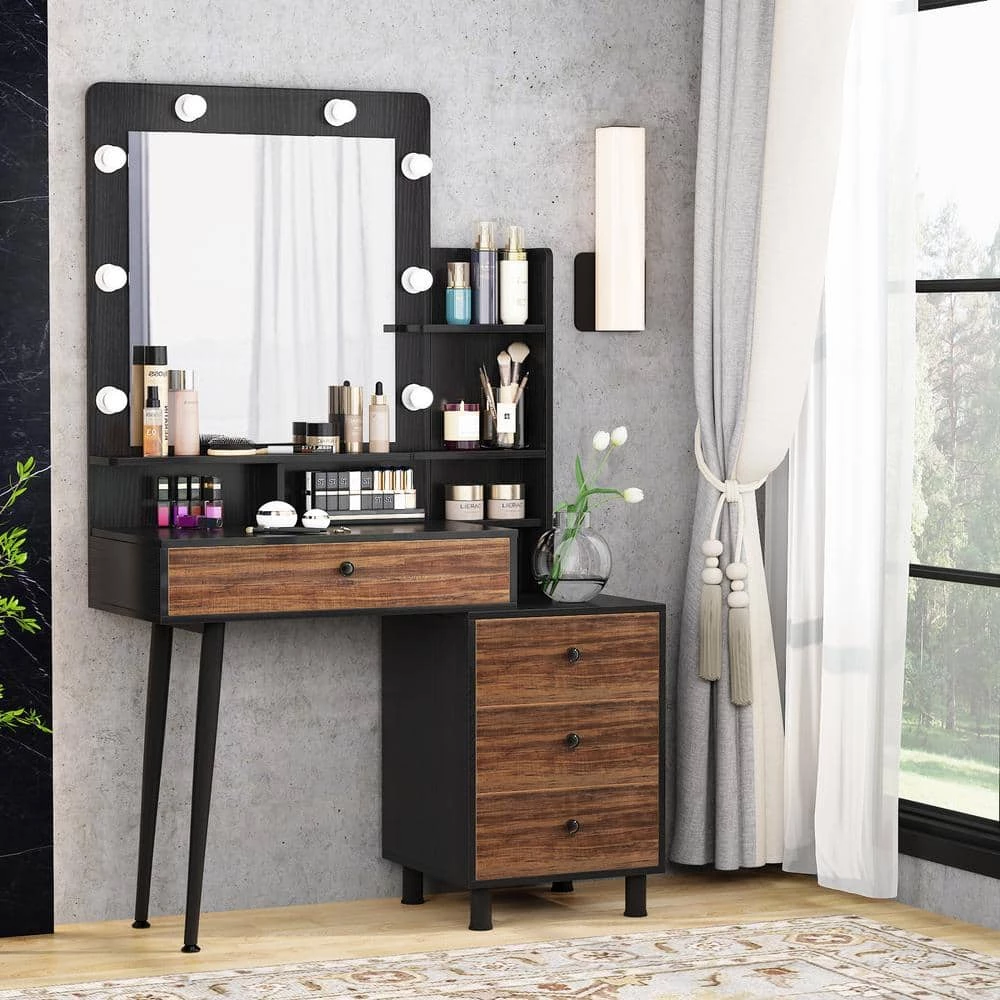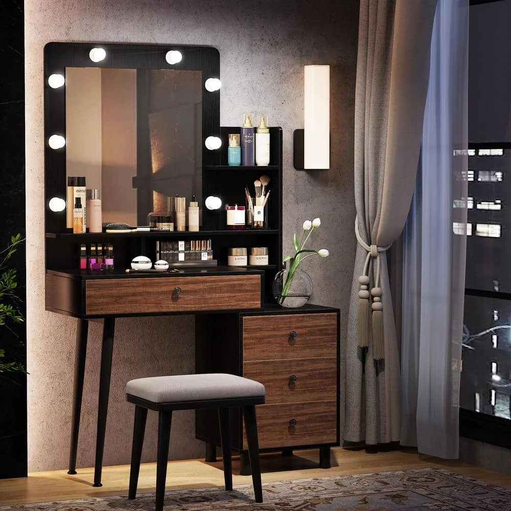 Delight your bedroom with this modern simple-line makeup vanity. This beautiful dressing table features a large mirror with 8 LED bulbs, which will illuminate skin tones and colors accurately in a dark room and help you do make up easily. Store the cosmetic and tools with 3+1 drawers and display your exquisite jewelry on the desktop.