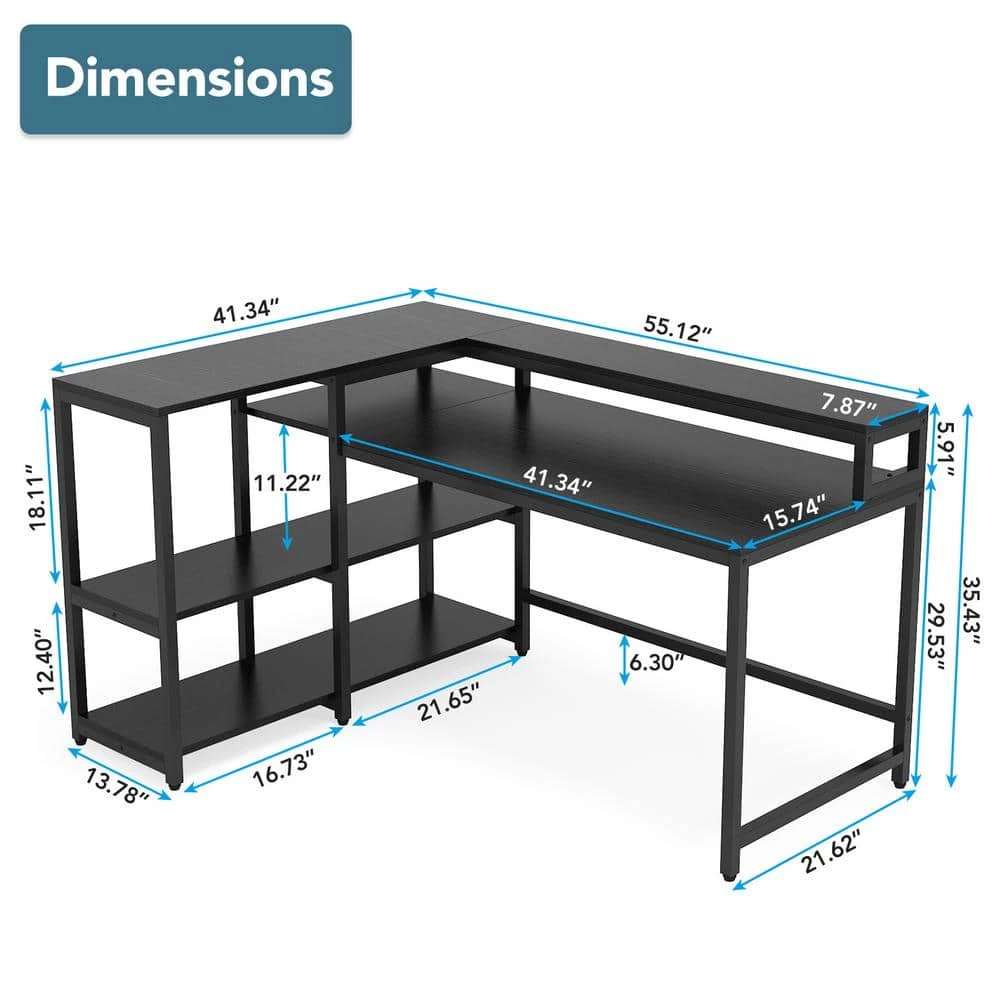 - Large desktop and ample space: with main desktop size 55 in. D x 41 in. W x 35 in. H, this L-shaped desk provides spacious workstation for writing, studying, gaming and other home office activities, under desk shelves offer ample space for your books and files, storage bag releases you from trouble of messy small stuffs