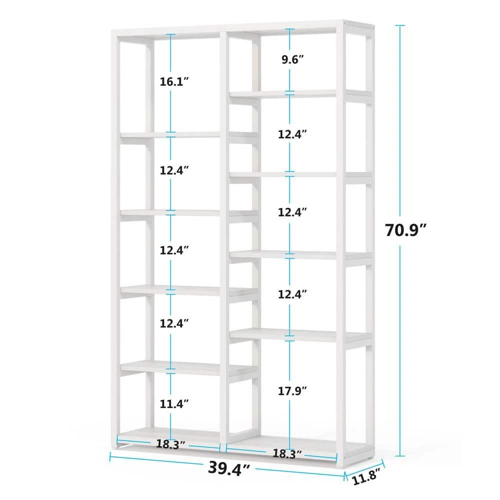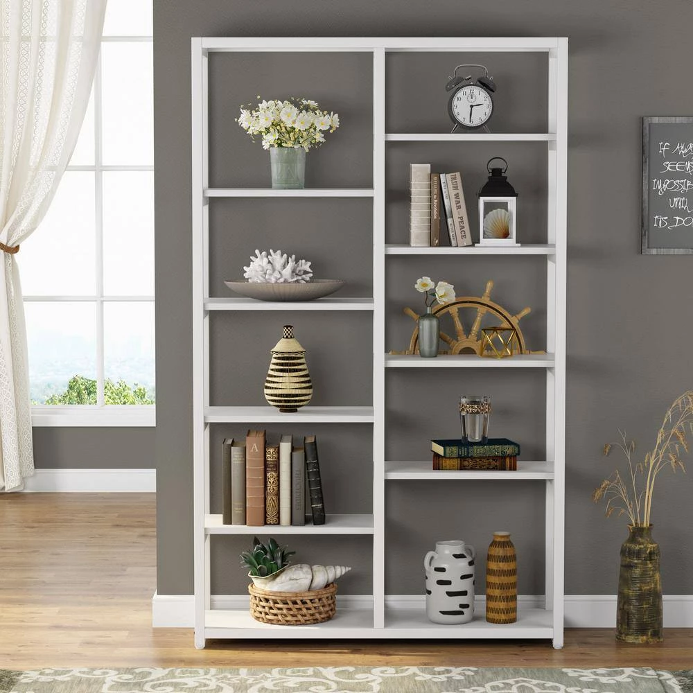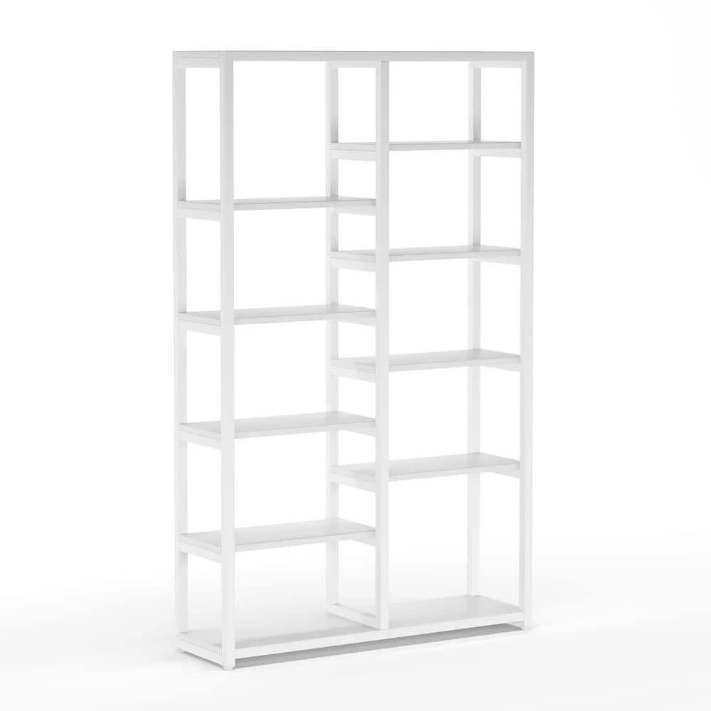 Lend any layout a dash of contemporary style and display space with this clean-lined bookcase. Featuring an open back panel and sides, this airy design showcases 5-tiers with asymmetrical shelves to show off items of all sizes. Each shelf is made from manufactured wood in an elegant white laminate finish. This bookcase measures 70.86 in. H x 39.37 in. W x 11.8 in. D. Assembly is required.