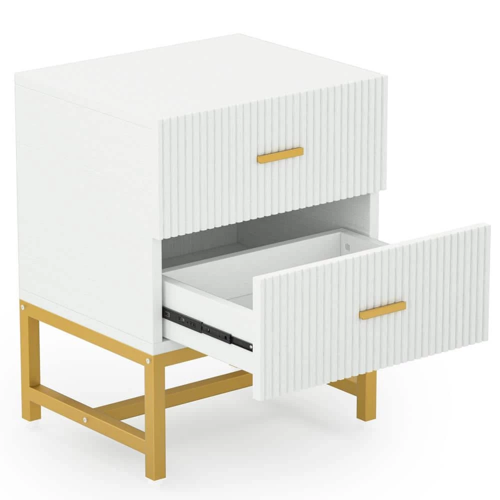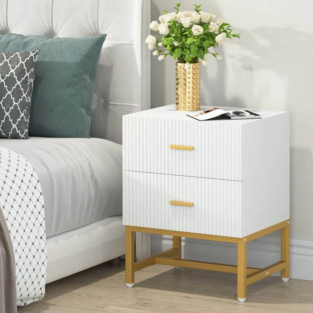 This nightstand design with special vertical stripe drawer panels in gold and white finish, craft from high-quality MDF board and metal frame, is a perfect nightstand for your bedroom, guest room, and also could be a lovely end table for your living room sofa, chair side. With such beautiful and elegant features, it is certainly making your room more charming and luxurious. With 2 large drawers and large tabletop, this nightstand will also add convenience for you to store bedroom essential things such as table lamp, magazines, alarm clock and laptop.