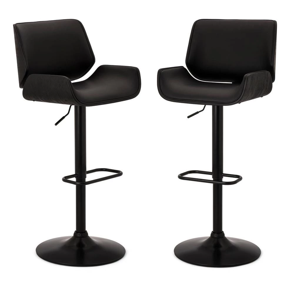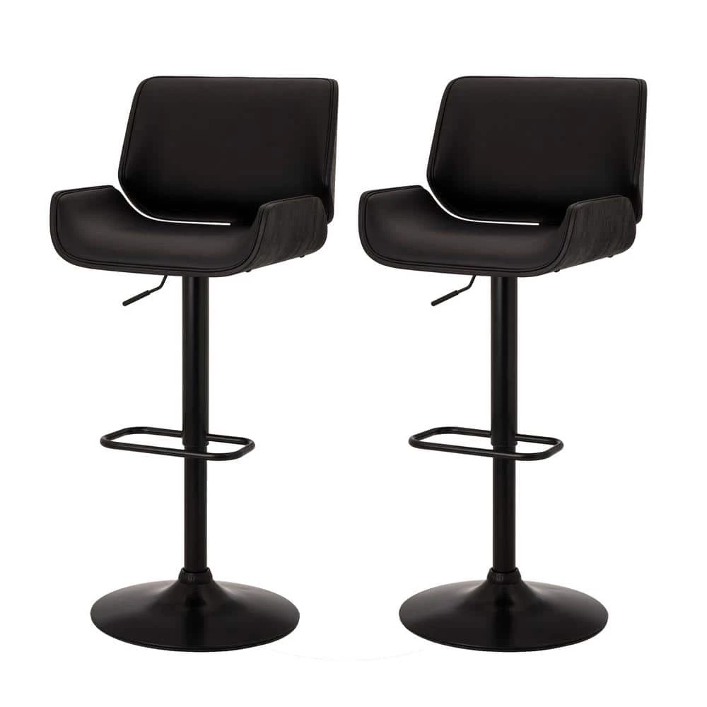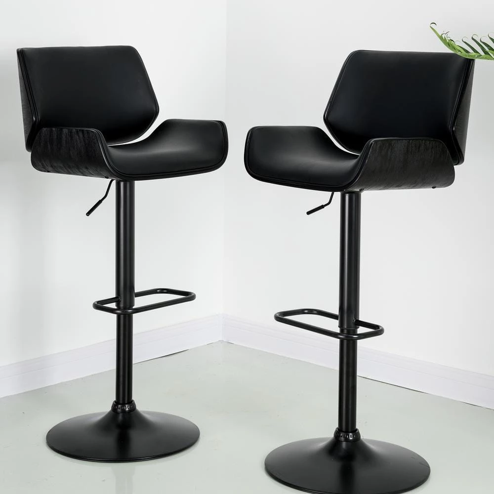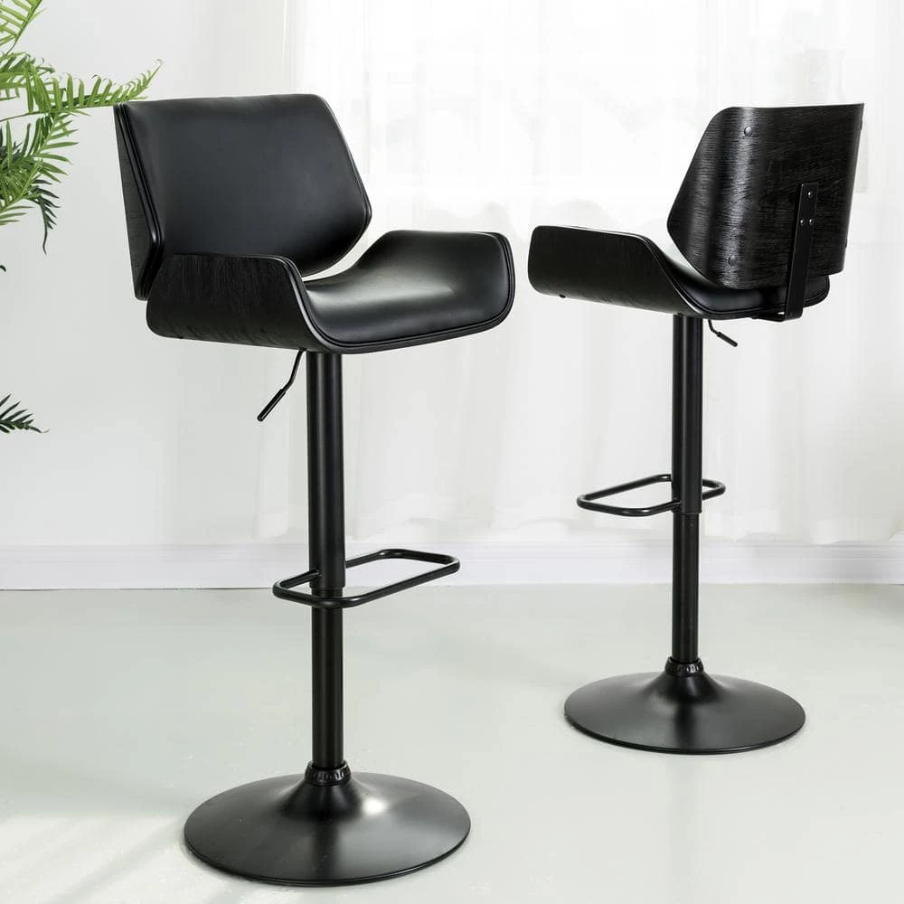 This adjustable height swivel bar stool made by PU black leather with strong metal black matte base and footrest. The gas lift bar adjusts the seat height from 25.6 in. – 33.67 in. high with a footrest below for comfort. The plywood curved stool back and seat are covered by black PU leather. This 360° swivel bar stool will be a stylish addition to your casual dining and entertainment area.