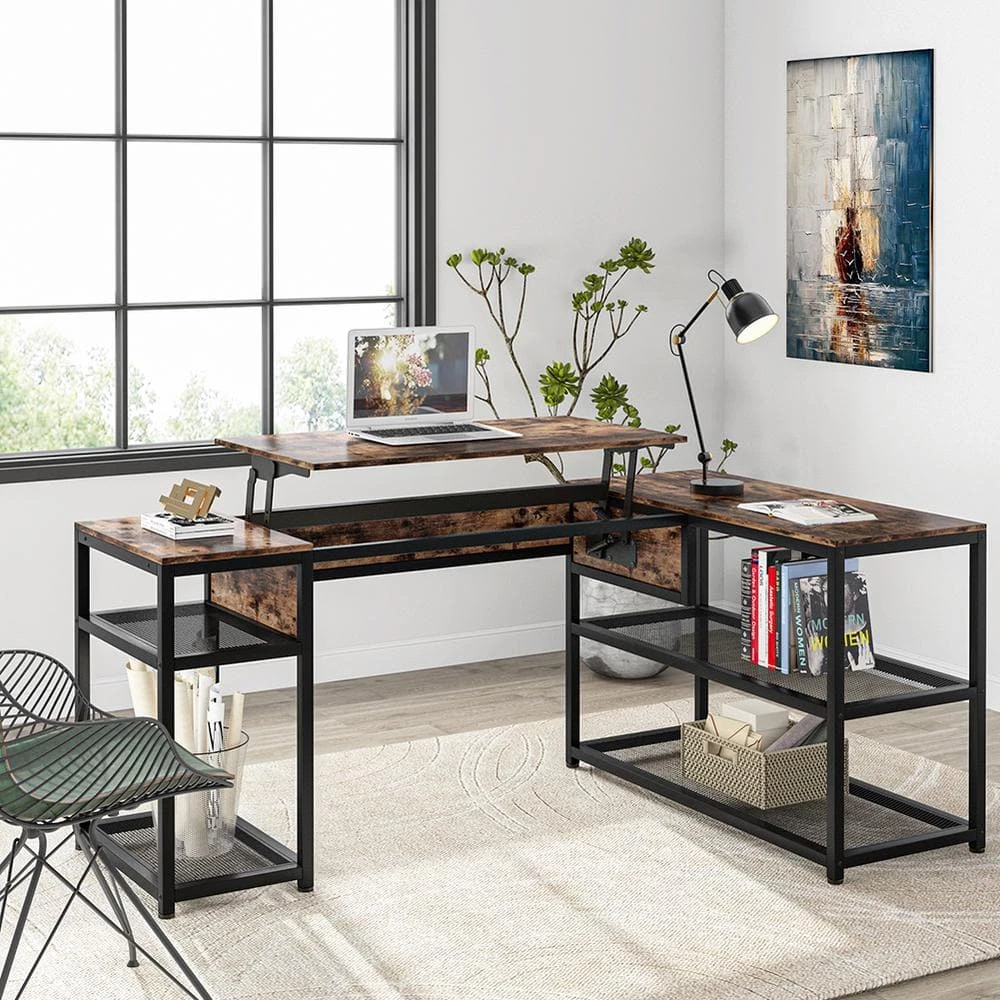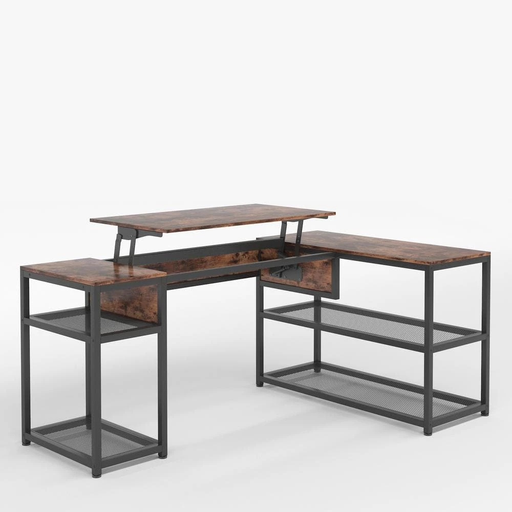 - Metal legs matched with rustic wood look desktop constructs a characteristic industrial look, the design of this dual l shaped standing desk fusing rustic details, industrial inspiration