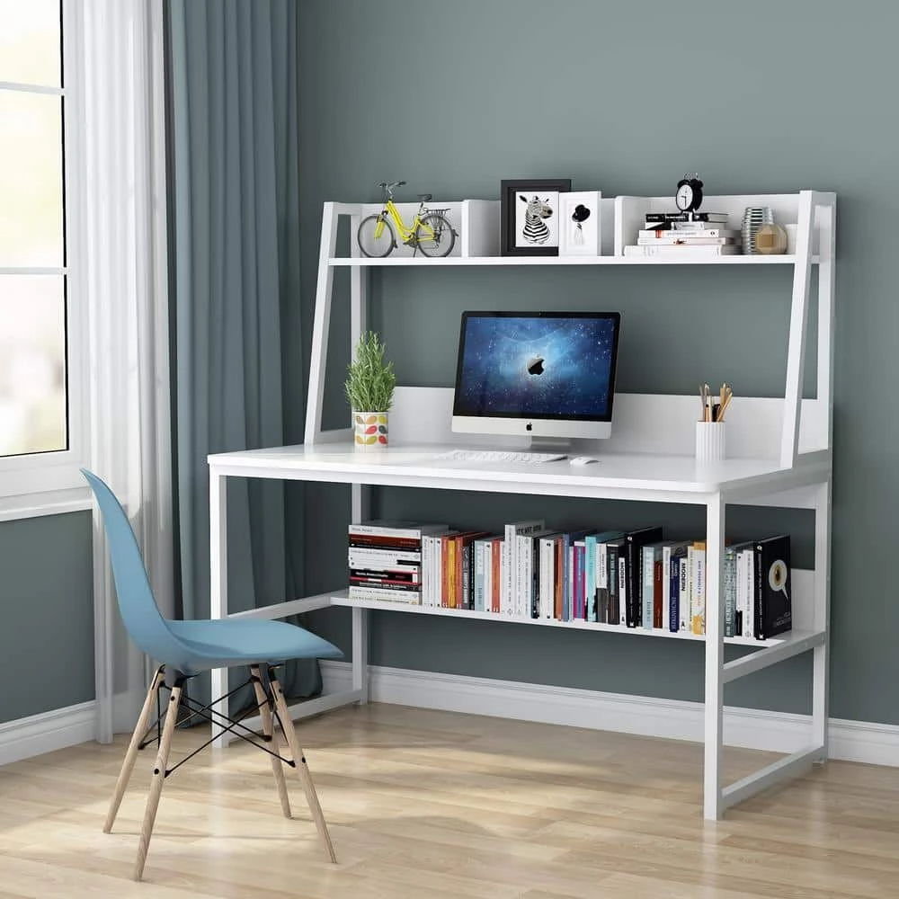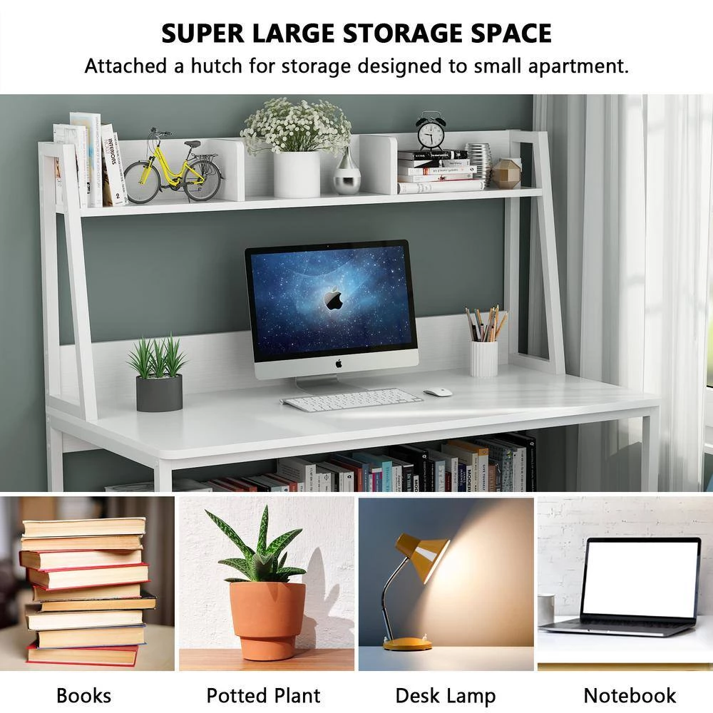 Its vertical design features a open bookshelf and attached a hutch saves floor space while enhancing storage options. And even with all your stuffs it still feels spacious!