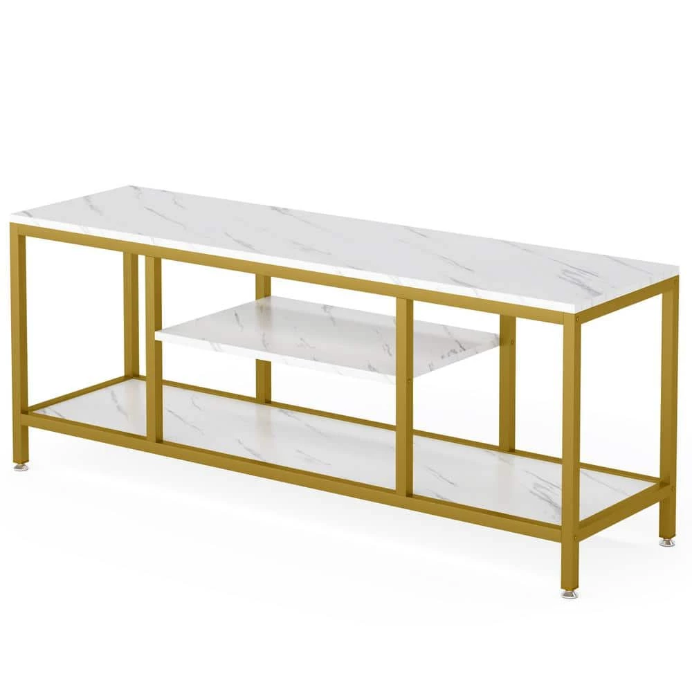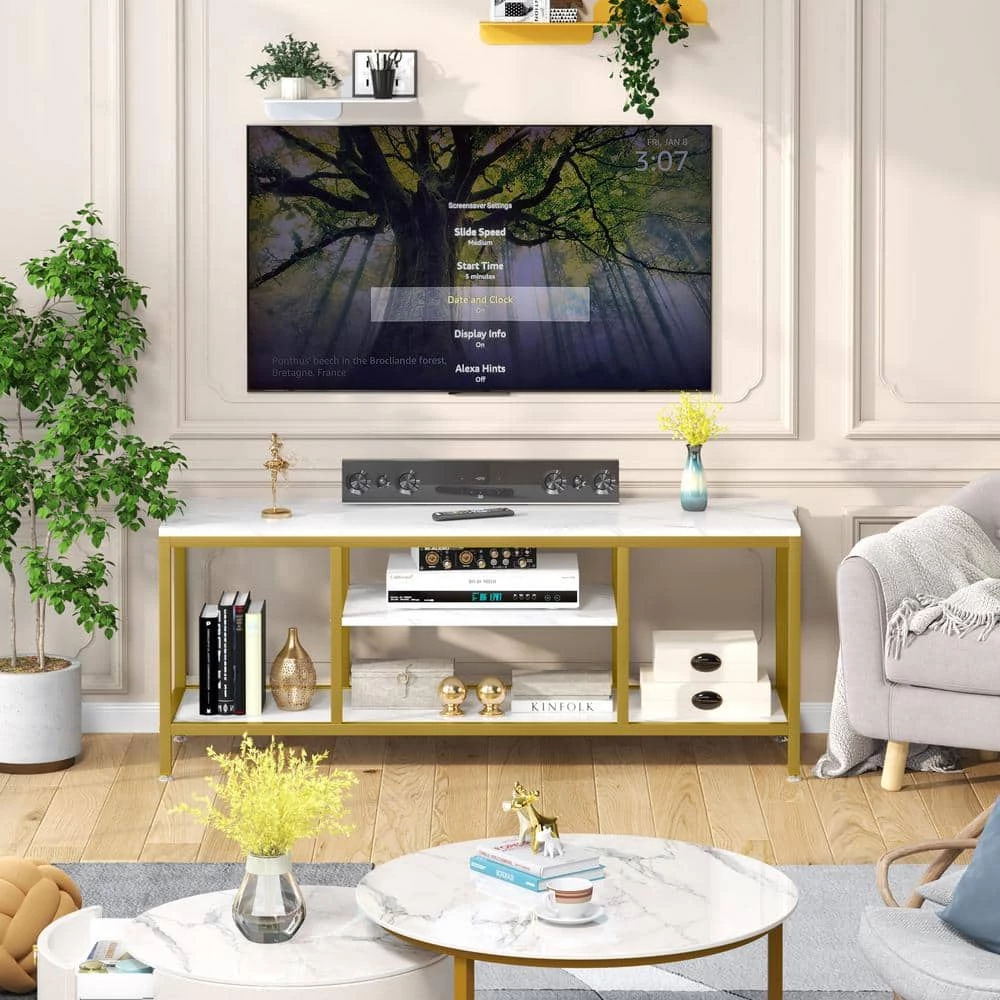 - A must-have for living areas and entertainment spaces, this TV stand sets the stage for the big game, a movie marathon, or that season finale everyone’s been talking about, crafted from steel, it strikes a clean-lined silhouette and boasts a metallic finish, the glass shelves add a look that blends with nearly any color palette