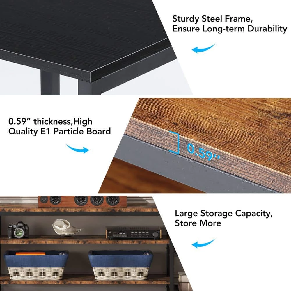 - With rustic brown shelves and classic matte black steel lines, it’s as stylish as it is practical, adding a touch of industrial charm to your entertainment center