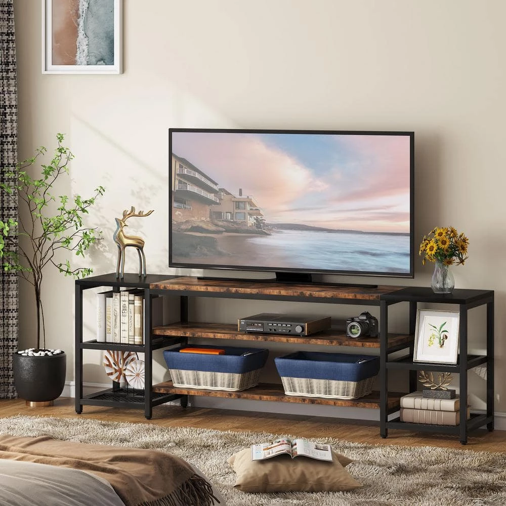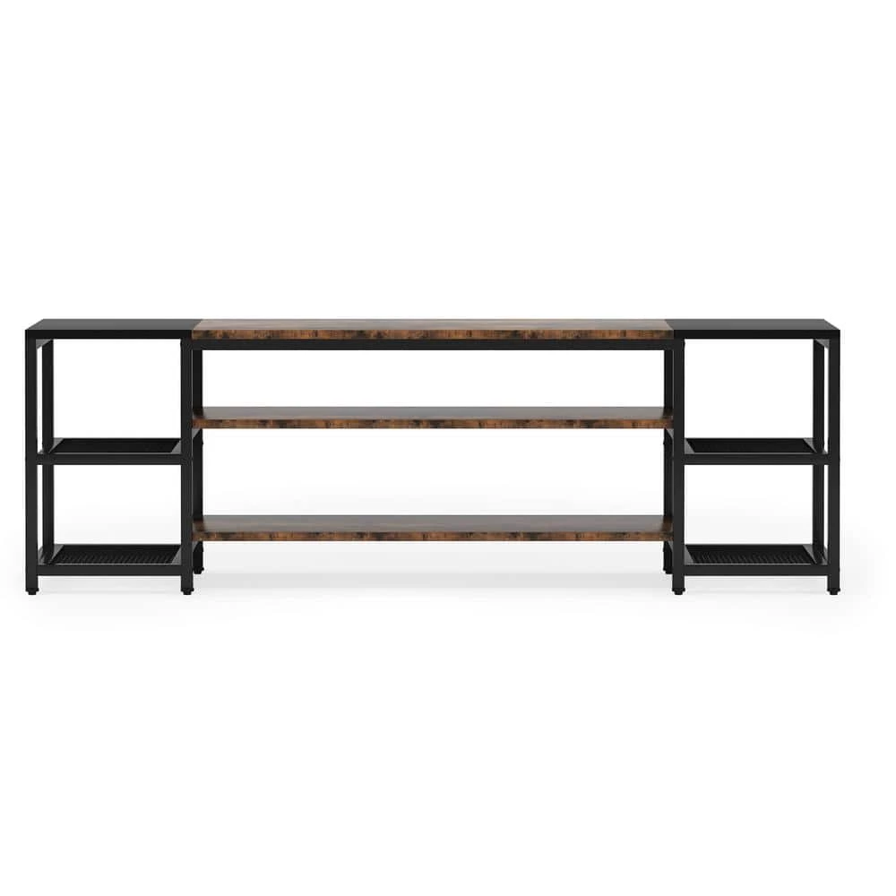 This extra-large industrial TV stand serves both an aesthetic and functional purpose, helping to tie your living space together while also giving you plenty of storage for your accessories to sit. A stylish setting to place your TV while adding a touch of vintage charm in your living space. The TV stand features an open display design including a 3-tier center compartment shelf and 2-side metal mesh shelves to provide easy storage and display of TV or other audio-video accessories, which brings a great way to upgrade a traditional space and make it classic and retro.