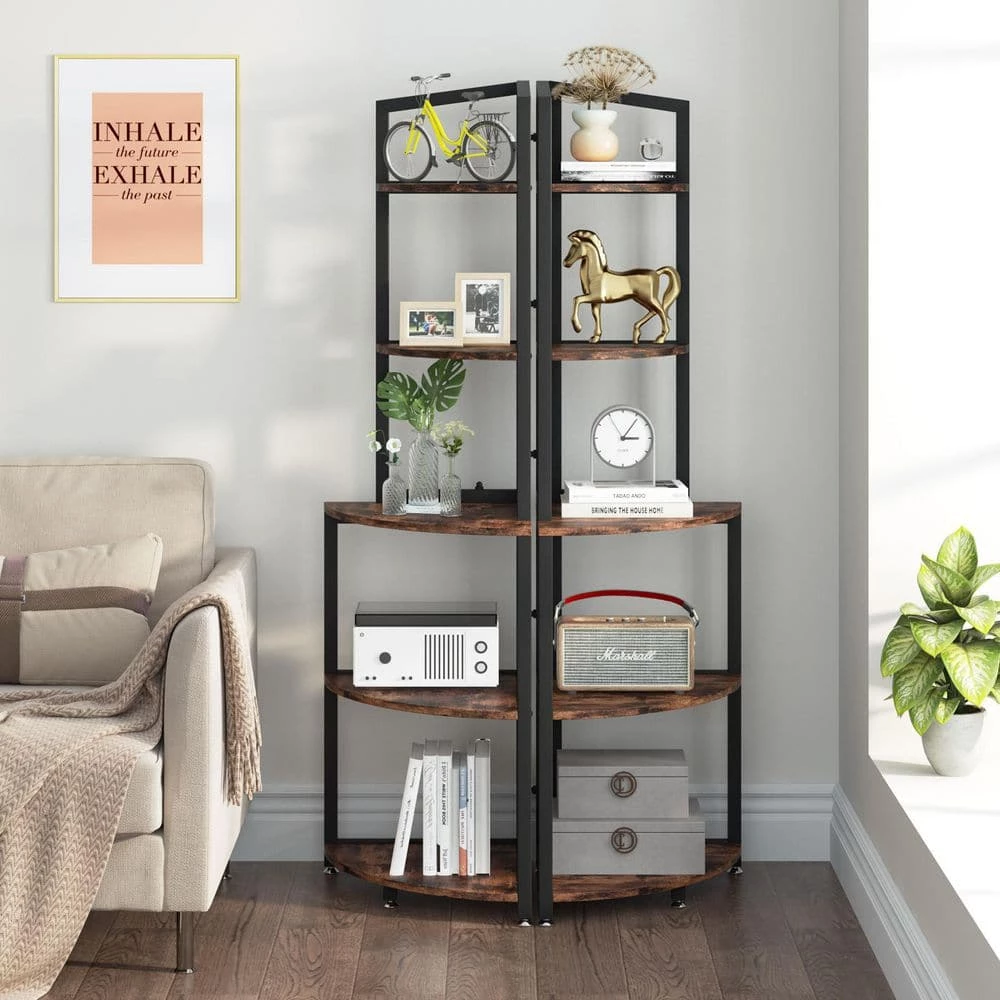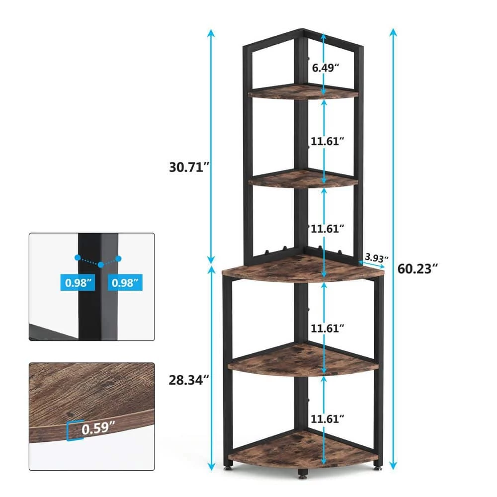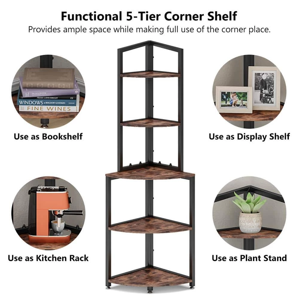 Maximizes corner space in your living room, bedroom, home office, kitchen, balcony or den with this 5-tier corner shelf unit. It will work perfectly as a corner storage, small bookcase, plant stand or display rack to help clear up the clutter. Multi-size shelves provide lots of display and storage space for your books, photo frames, plants and your favorite decoration.