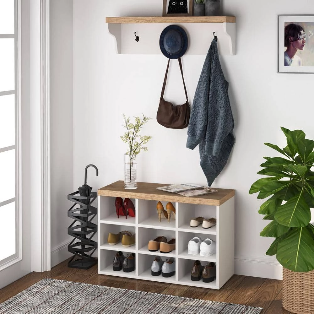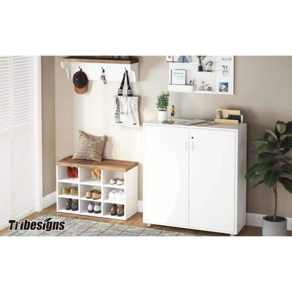 This modern white shoe storage cabinet features 9 shoe storage cubes and 1 wall mount coat rack with 3 hanging hooks are from TRIBESIGNS WAY TO ORIGIN. The shoe cabinet and wall hall tree could provide ideal storage space for shoes, jackets, coats, and bags. And it is sweet to have this unit in your foyer and entranceway while there is visitor and guests, there is the perfect place for their shoes and coats, not only could add convenience but also could help you organize shoes and coats, and keep your room tidy and clean.